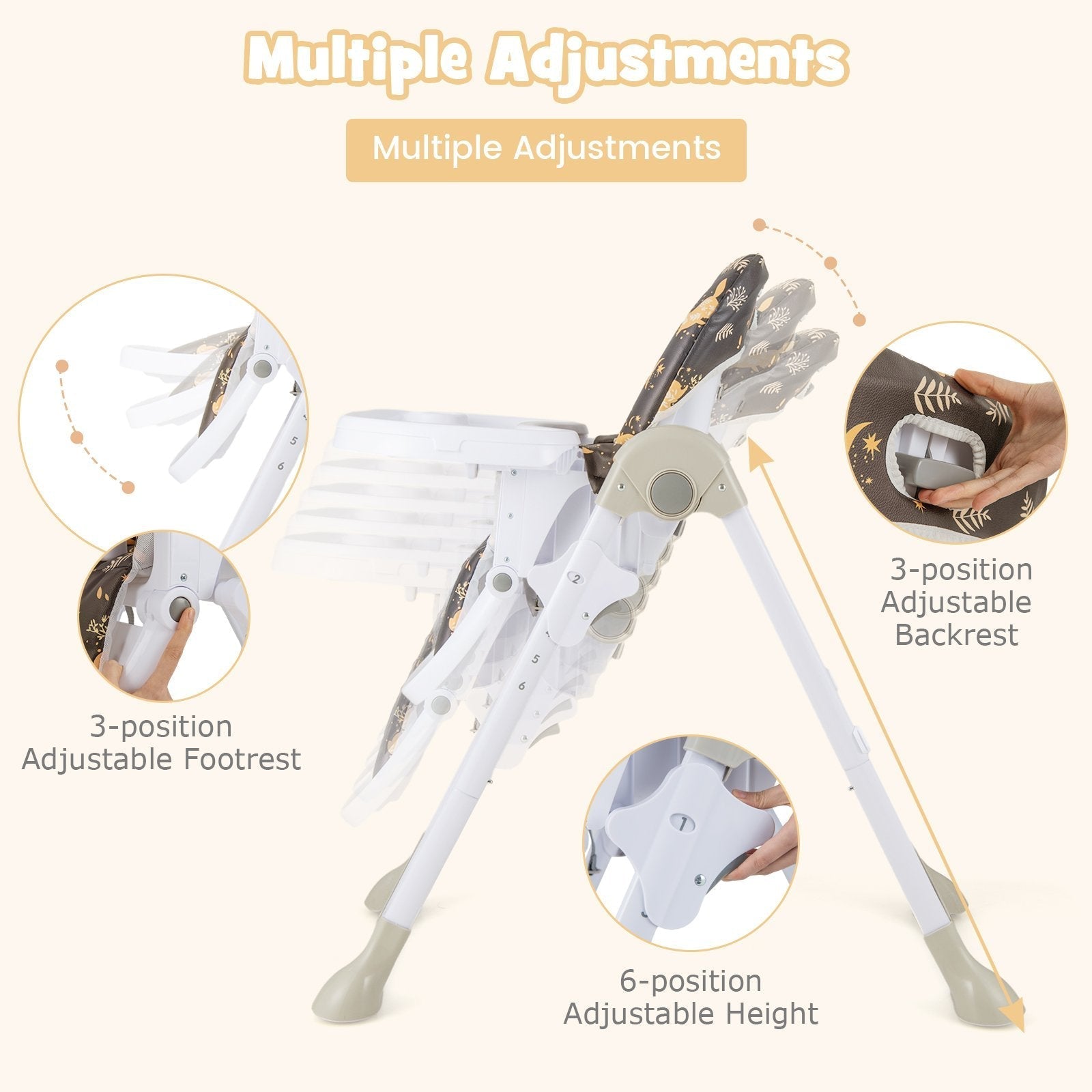 With adjustable height, backrest, and footrest positions, this infant high chair gratifies the various needs of your baby. It allows for feeding, eating, playing, and more. The washable tray has 3 positions and a cup holder, while being dishwasher safe for easy cleaning. You can remove and attach the tray to the chair’s rear legs for space-saving storage when it‘s not in service. What’s more, the highchair folds into a compact size for simple storage and transport. Designed for comfort, there is a soft cushion. Safety is a priority with an anti-falling baffle and 5-point harness with 3 optional positions. Furthermore, the reliable materials promise durability and sturdiness. Multipurpose Baby Highchair: This baby high chair boasts 6-posiiton adjustable height, 5-position adjustable backrest, and 3-position adjustable footrest. It serves as a traditional highchair, infant highchair as well as toddler chair, making it suitable for feeding, eating, playing and other activities. Adjustable and Washable Tray: The foldable high chair features a double-layer tray with a cup holder and 3-position adjustment for different needs, which is dishwasher safe to simplify cleaning. When not in use, the tray can be removed and attached to the rear legs of this infant dining chair to save space. Hassle-free Storage and Transport: By pressing buttons on both sides, you are able to fold this baby high chair quickly and easily. With a compact folding size of 55 x 32 x 117 cm (W x D x H), it is easy to store in any corner or transport in the trunk of your car. Designed for Comfort and Safety: The convertible infant dining chair offers a soft PU cushion for optimal comfort. Moreover, the 5-point safety harness with 3 positions for option and anti-falling baffle ensure safe use. The rounded corners also prevent accidental scratches to your baby. Durable and Stable Construction: Made of reliable PP material and supported by strong metal tubes, the folding highchair is built to last. Additionally, the front legs are equipped with wheels for easy movement, and the rear legs are designed with non-slip foot pads, further enhancing overall stability.