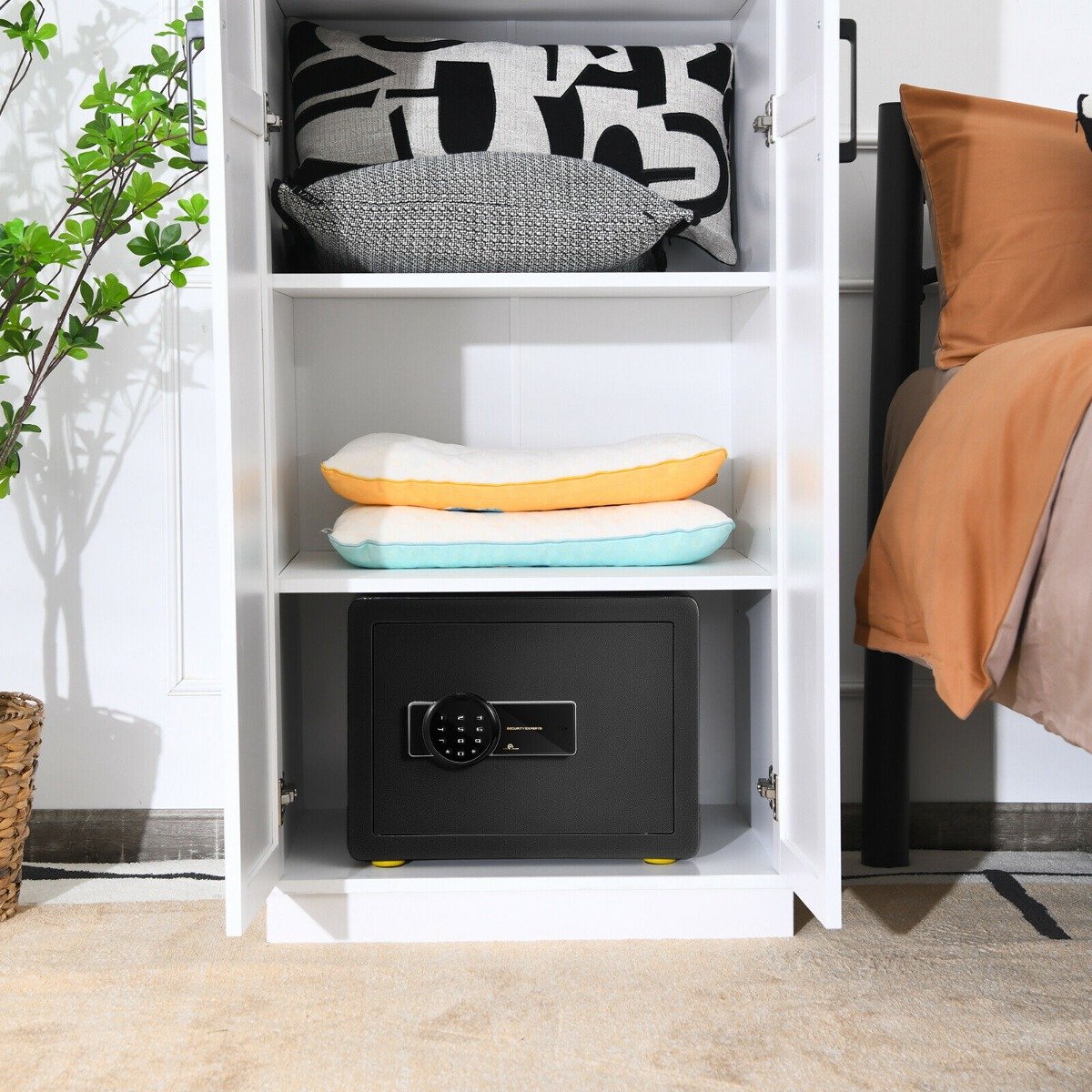Give your valuables a safe home! The security safe box is made of reinforced carbon structural steel which is extremely sturdy that significantly protects against force opening. If you are looking for a safety box like this, do not hesitate to place an order! ● 2 Unlocking Methods: Equipped with a digital password lock and 2 emergency keys, the cash box provides double security for your valuables. You can set your personal password of 3-8 digits conveniently. When the battery suddenly runs out or you forget the password, the emergency keys will help you go out of your predicament. ● Reliable Warning System and Anti-peeping Code: The alarm sound will go off and the red indicator will flash if 3 times of failed password attempts. Only after the correct code is entered can the warning system stop. Better yet, the security safe features mask code technology that effectively avoids peeping. ● Flexible and Large Storage Space: Designed with a removable shelf, the safe box can be conveniently created with a two-layer partition to satisfy your storage needs of items in different sizes. Additionally, a large capacity allows you to store your cash, jewellery, watch, passports, secret documents, and other valuables. And the hooks on the door will accommodate your need to hang some keys and necklaces. ● High-quality Materials: Crafted from heavy-duty carbon structural steel with delicate workmanship, this safe box is pry-resistant, anti-theft and anti-drilling. What’s more, the safe comes with triple solid lock bolts to improve security and reliability, making you peace of mind. ● Easy to Install and Wide Application: This electronic safety cabinet comes with 2 pre-drilled holes and 2 expansion bolts for mounting to the wall or cabinet, which adds extra security for your valuables. With the space-saving and practical design, the lockbox is perfect for home, office, hotel, or business safe use.