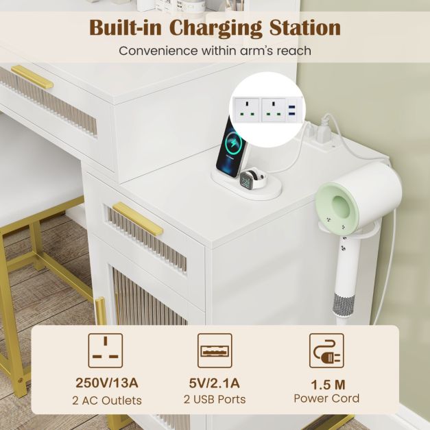 Dressing Table and Chair Set with 3 Lighting Modes and Adjustable Brightness-White