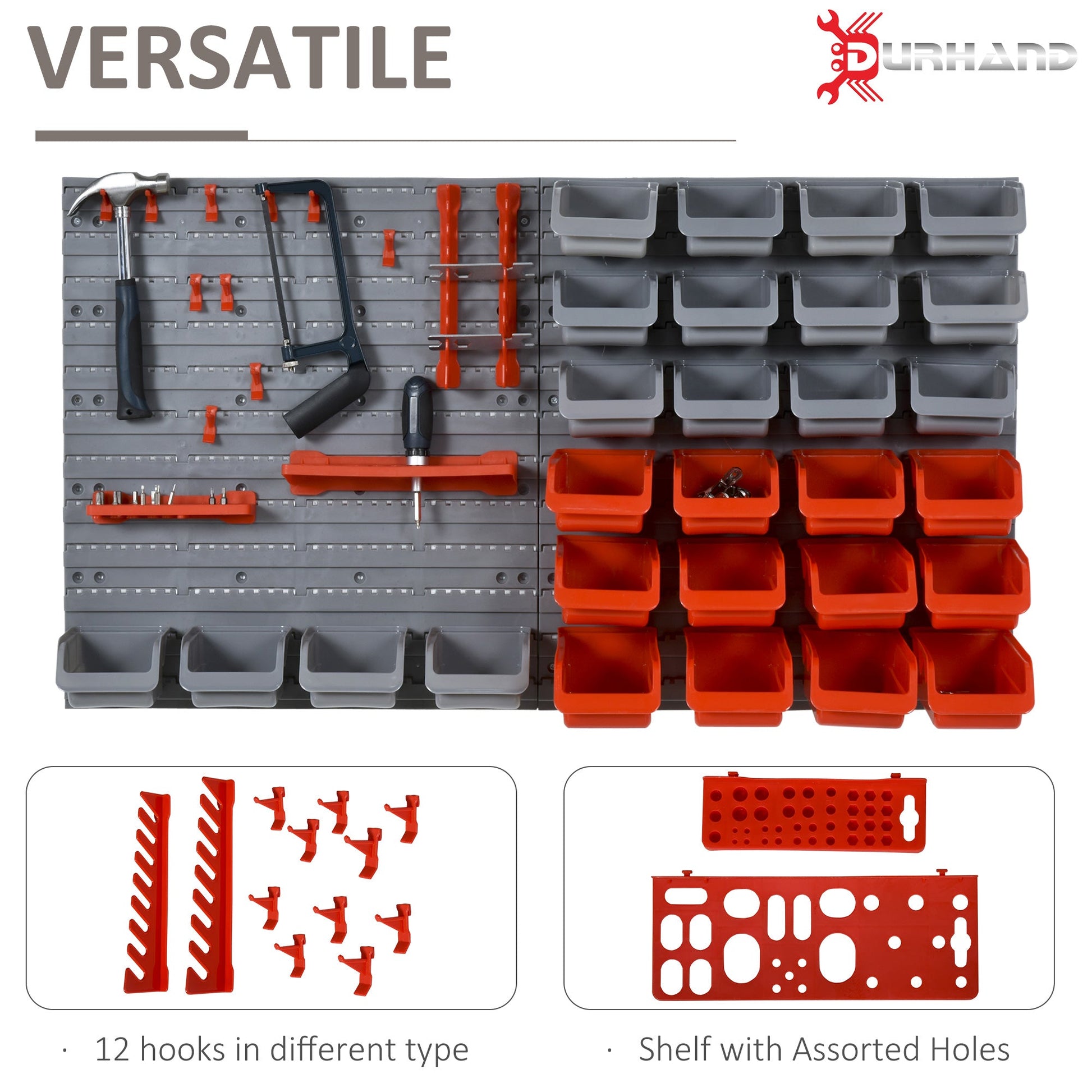 DURHAND 44 Piece Wall Mounted Tool Rack Organiser Storage Bins and Panel Set with Shelf Hook Screws Accessories Red