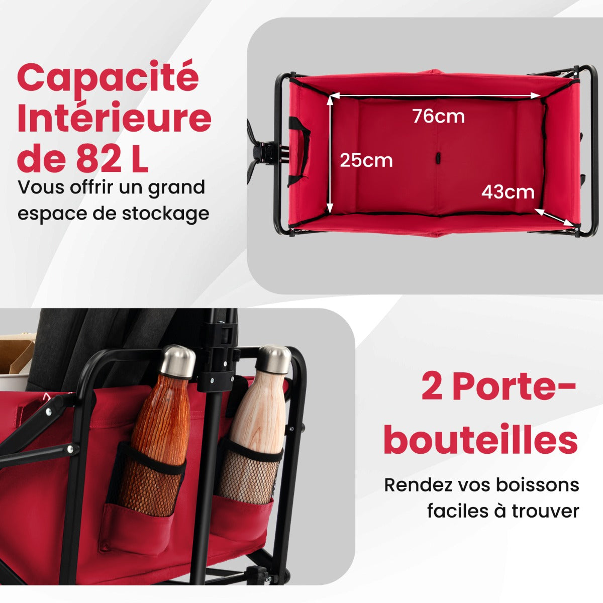Color: Navy Blue/Black/RedMaterial: Metal, Oxford ClothUnfolding Dimension: 94 x 52 x 76-100 cm (L x W x H)Inner Dimension: 76 x 25 x 43 cm (L x W x H)Folding Dimension: 27 x 52 x 76 cm (L x W x H)Net Weight: 9 kgCapacity: 82LWeight Capacity: 68 kg Package Includes:1 x Foldable Wagon1 x Carrying Bag