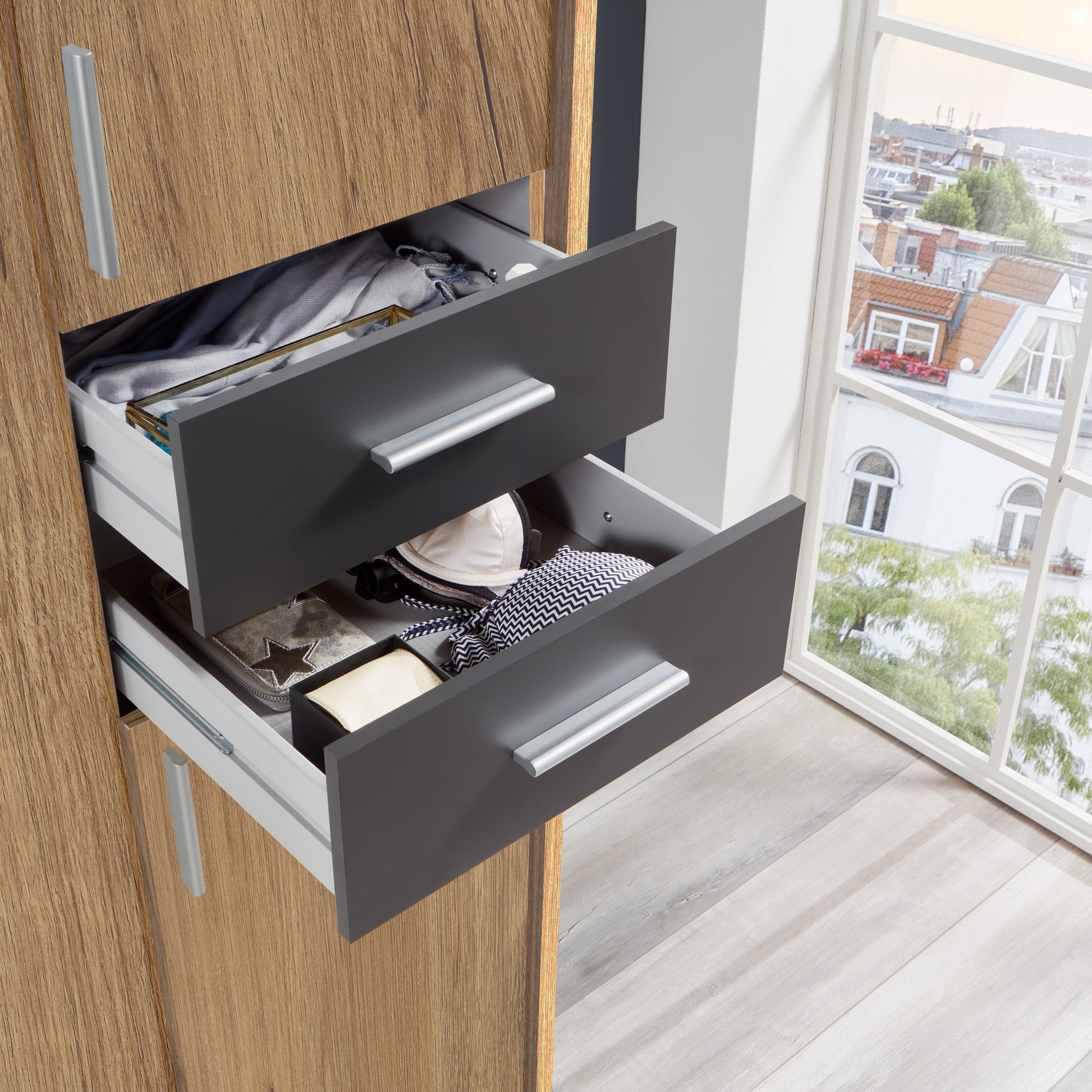 The FENTON graphite 5 Door wardrobe has a sleek and contemporary look, finished with Mirrored door. The wardrobe has trendy handles which gives the wardrobe a modern look. The wardrobe has 2 hanging rail and total 8 shelves divide in four section.