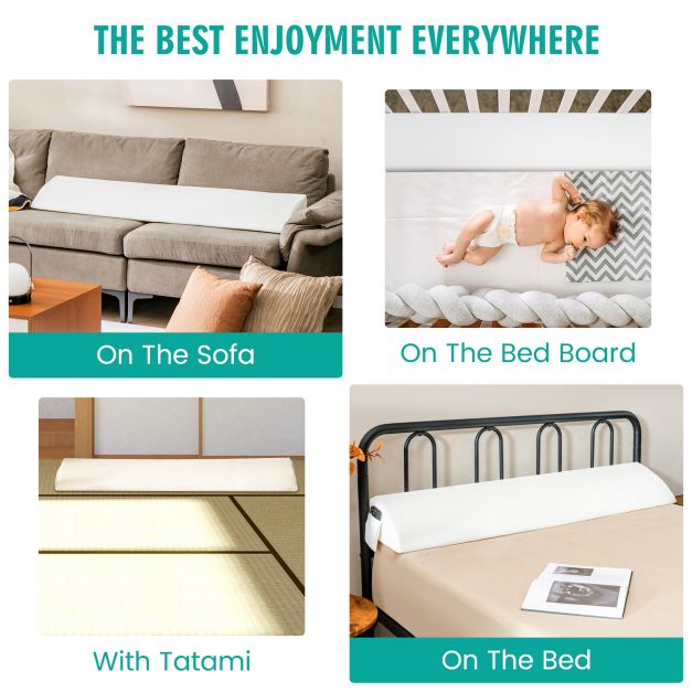 Color: White Material: 25D sponge, polyester Full size: Overall dimension: 137 x 25 x 14cm (L x W x H) Max gap length: 18cm Net weight: 1kg Queen size: Overall dimension: 152 x 25 x 14cm (L x W x H) Max gap length: 18cm Net weight: 1.5kg Package includes: 1 x Bed wedge pillow