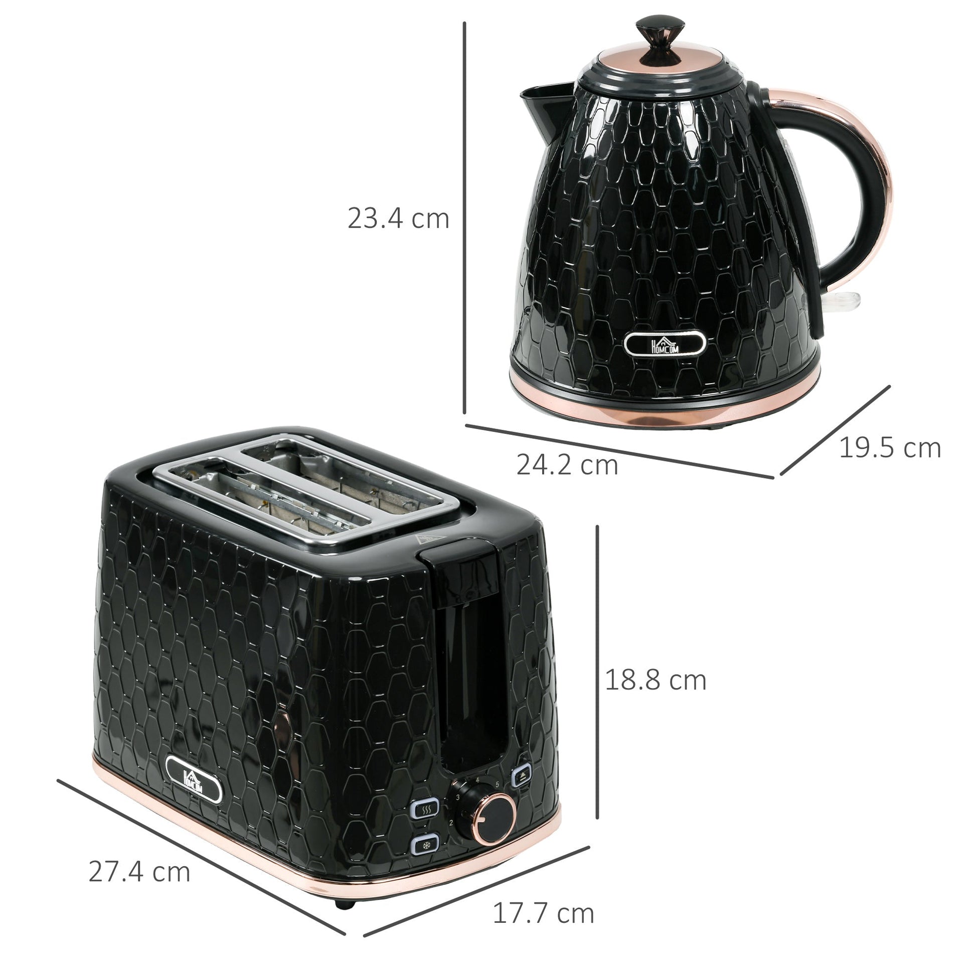 - 1.7L fast boil kettle and matching two-slice toaster. Stylish honeycomb design