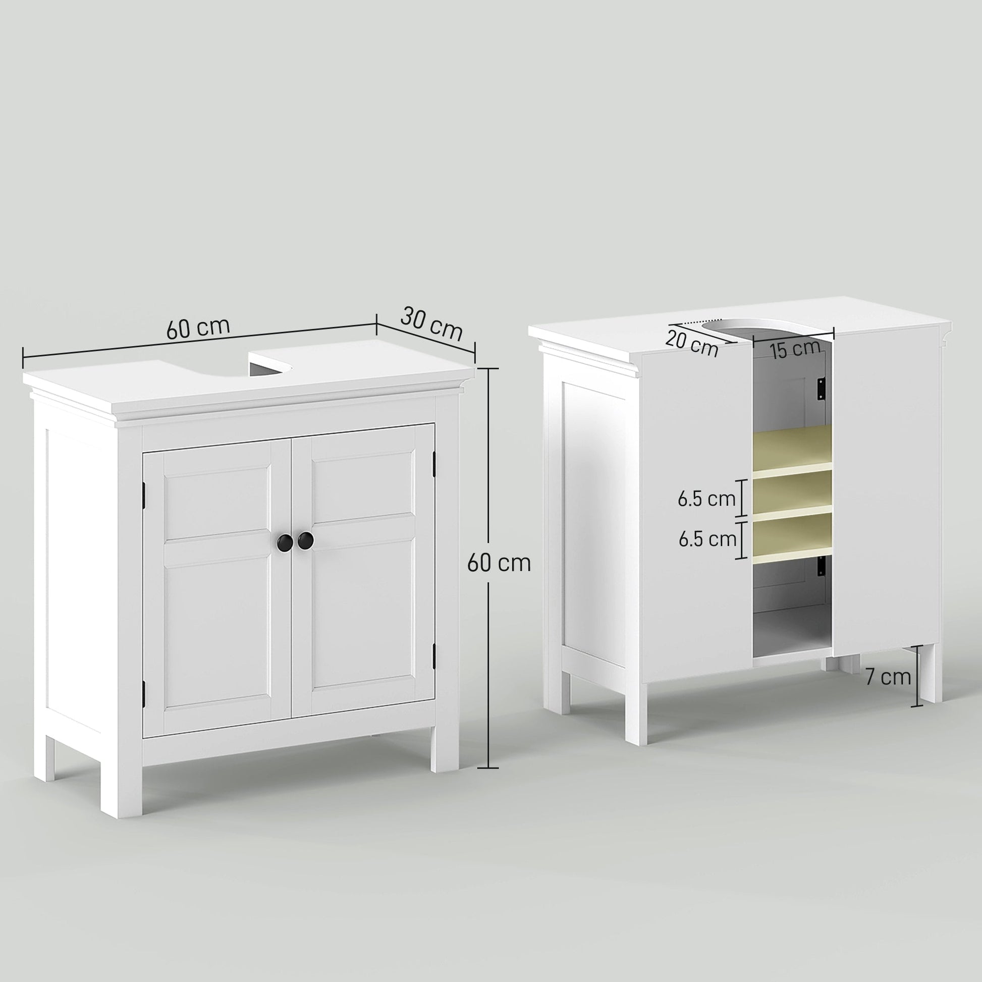 Extra space in the bathroom, easily with this HOMCOM under sink storage cabinet. Thanks to the 'U' slot, this bathroom storage cabinet snugly fits around wall-mounted sinks. Features two shelves, with three-level adjustable shelf for flexible storage. Our under sink unit completes with handy magnetic doors for easy access.