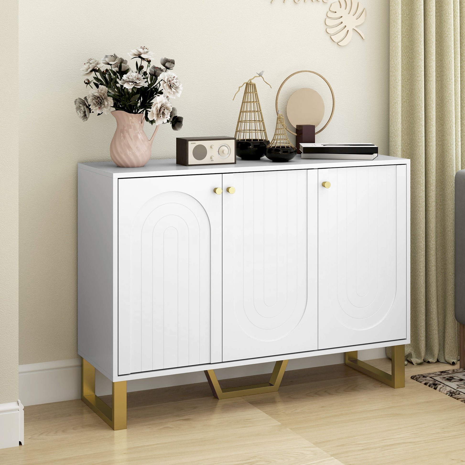- Arched embossed doors, gold tone handles and legs enhance aesthetic appeal