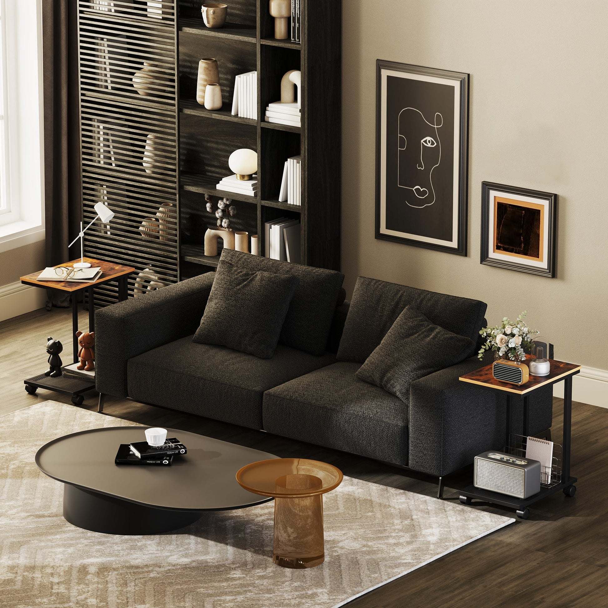 HOMCOM C Shaped Side Table Set of 2 with Wheels, Mobile End Table, Laptop Stand with Metal Frame and Storage Shelf, Rustic Brown