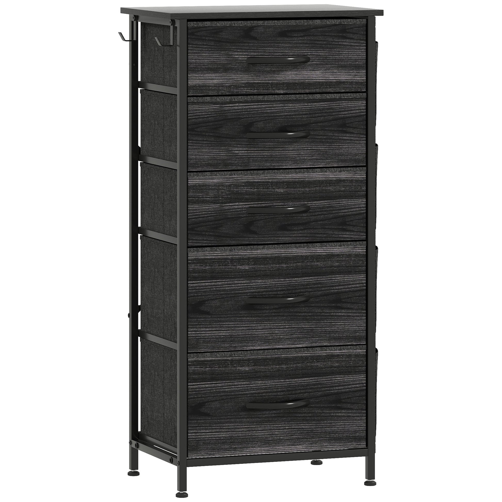 Easy, simple storage with this HOMCOM fabric chest of drawers. With three small and two large drawers, it's easy to sort everything from socks to pants. It also features four side pockets and two hooks to get smaller accessories altogether. A steel frame with X-bars keeps this bedroom dresser stable, finished with adjustable feet for balance - even on unsteady grounds.