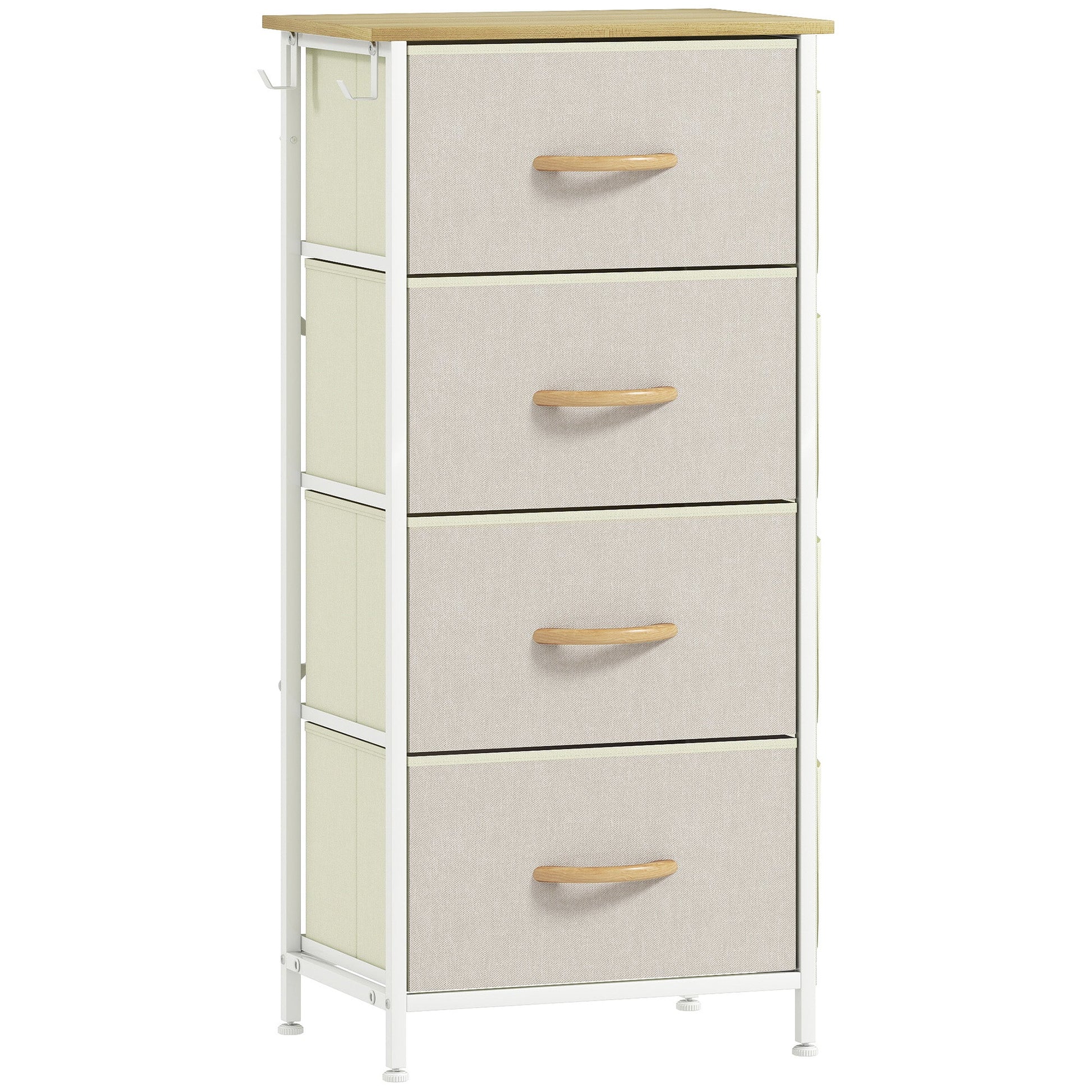 Easy, simple storage with this HOMCOM fabric chest of drawers. With four same drawers, it's easy to sort everything from socks to pants. It also features four side pockets and two hooks to get smaller accessories altogether. A steel frame with X-bars keeps this bedroom dresser stable, finished with adjustable feet for balance - even on unsteady grounds.