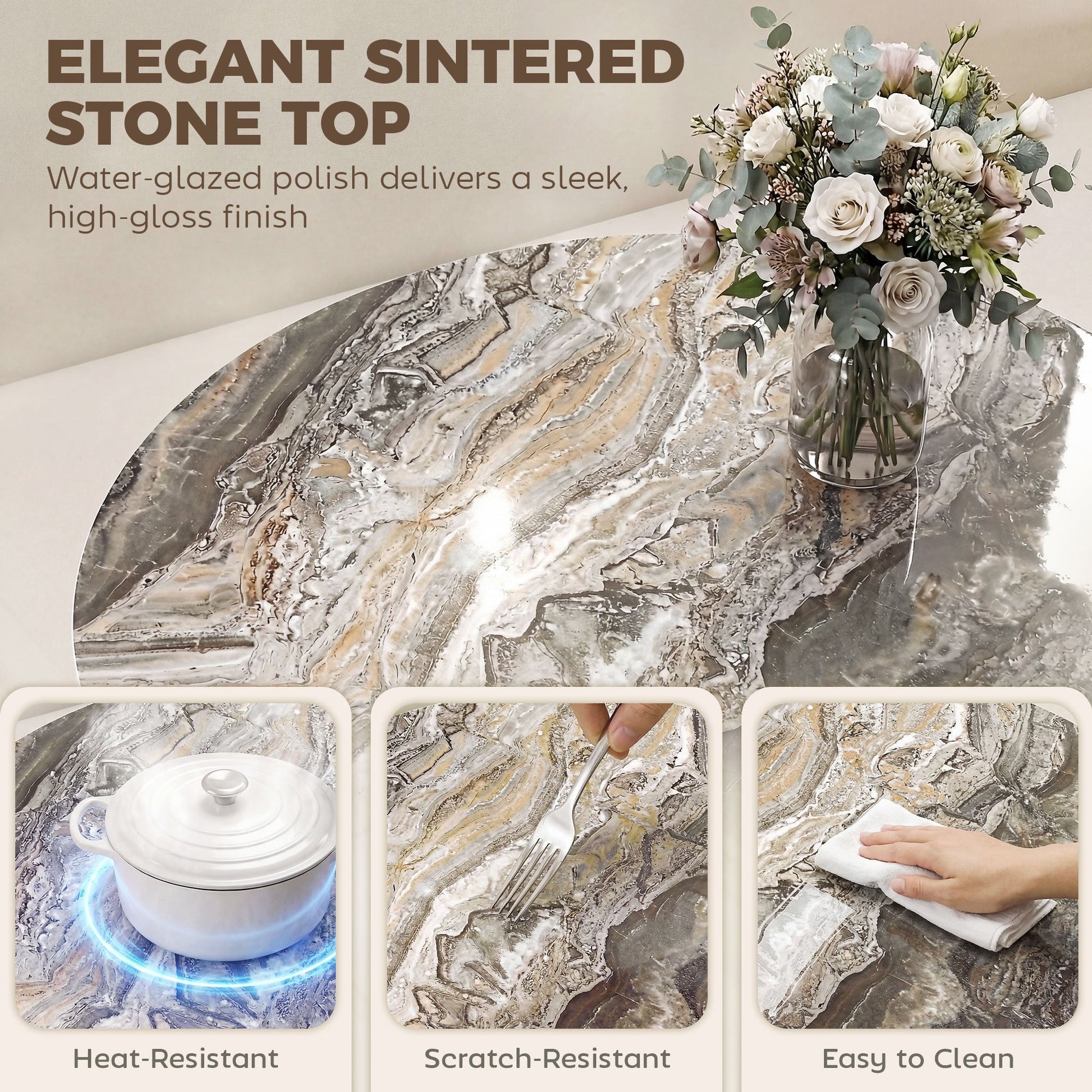 - Elegant sintered stone top is heat-resistant and impermeable, great for hot drinks