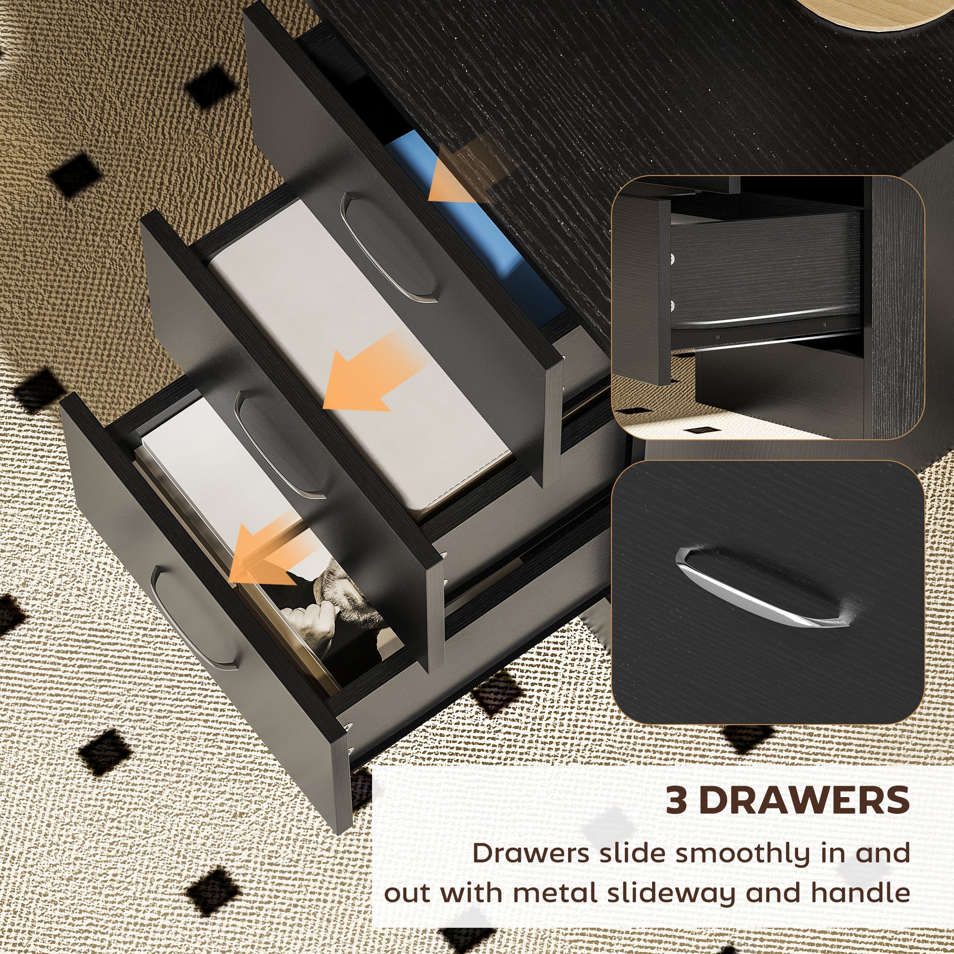 - Handle on each drawer for easy opening and closing