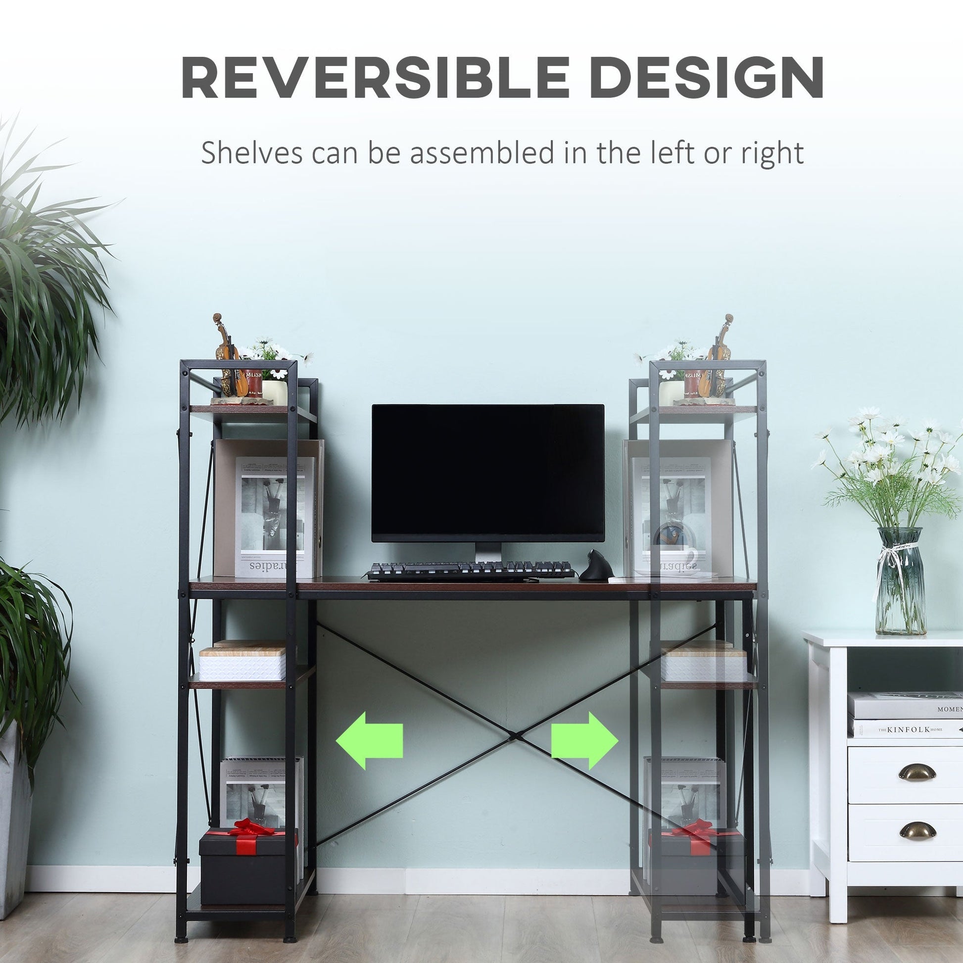 The industrial writing desk from HOMCOM is designed with space-saving and multifunction in mind. It comes with a 4-tier bookshelf which can be assembled on left or right side as required. The large open area underneath enables you to comfortably stretch your legs after long working hours. With elegant and functional design, this desk with shelves is a great addition to your study or living room and can be used for either home office.