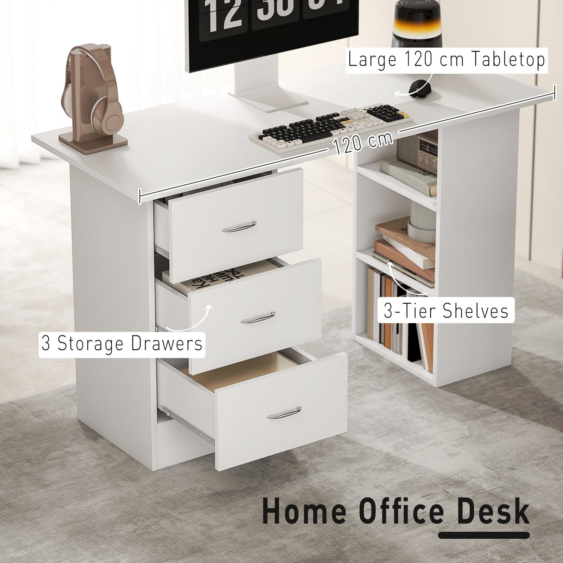 Maintain a contemporary and minimalistic workspace using HOMCOM's desk with drawers. Crafted from particle board, this study table showcases a clean boxy design in a neutral colour, suitable for various home office environments. It offers three enclosed drawers and three open shelves, providing a balanced solution for work essentials and decor. The drawers feature convenient handles for a polished finish.