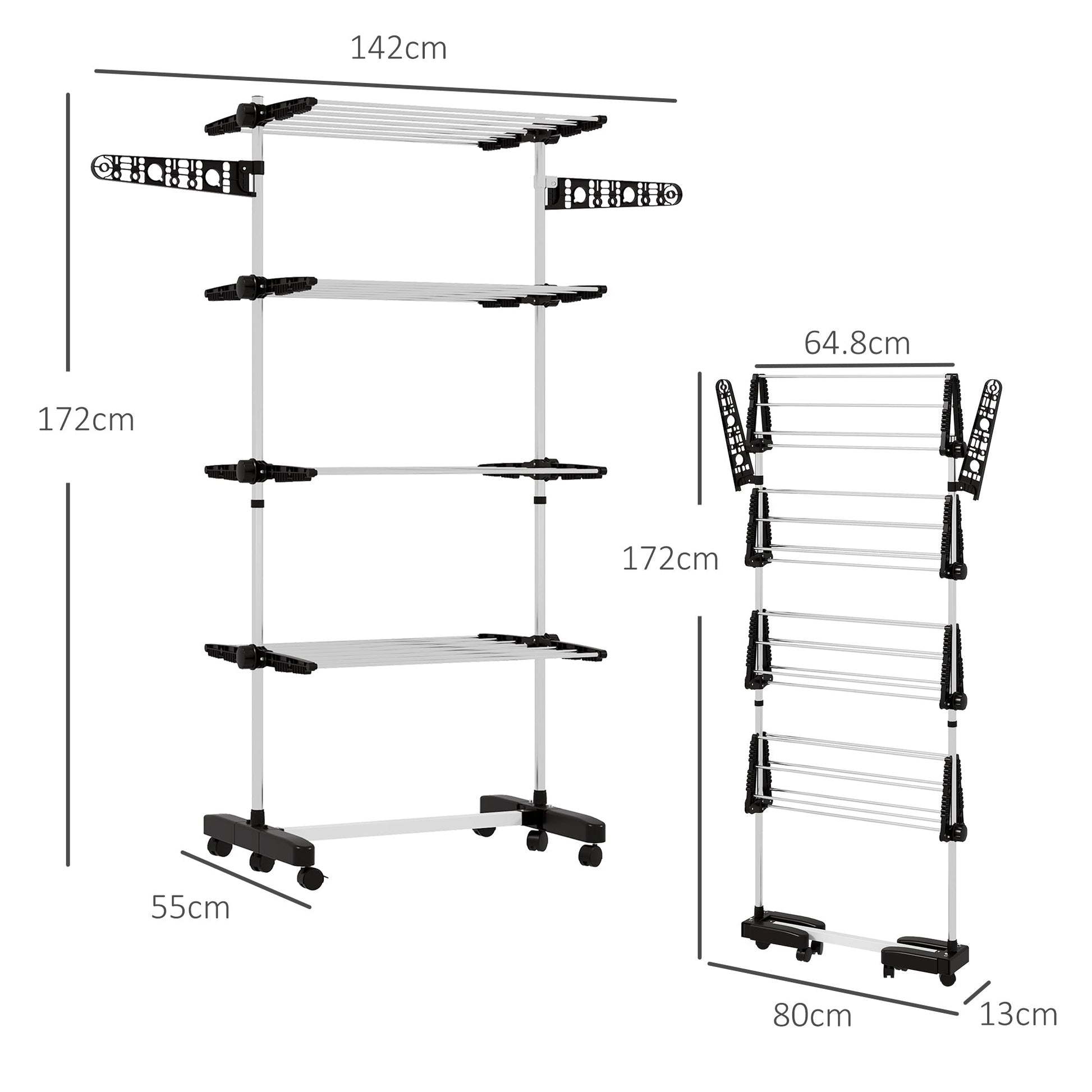 - 64.8cm of space offers plenty of room for drying clothes. Four adjustable height shelves and two arms