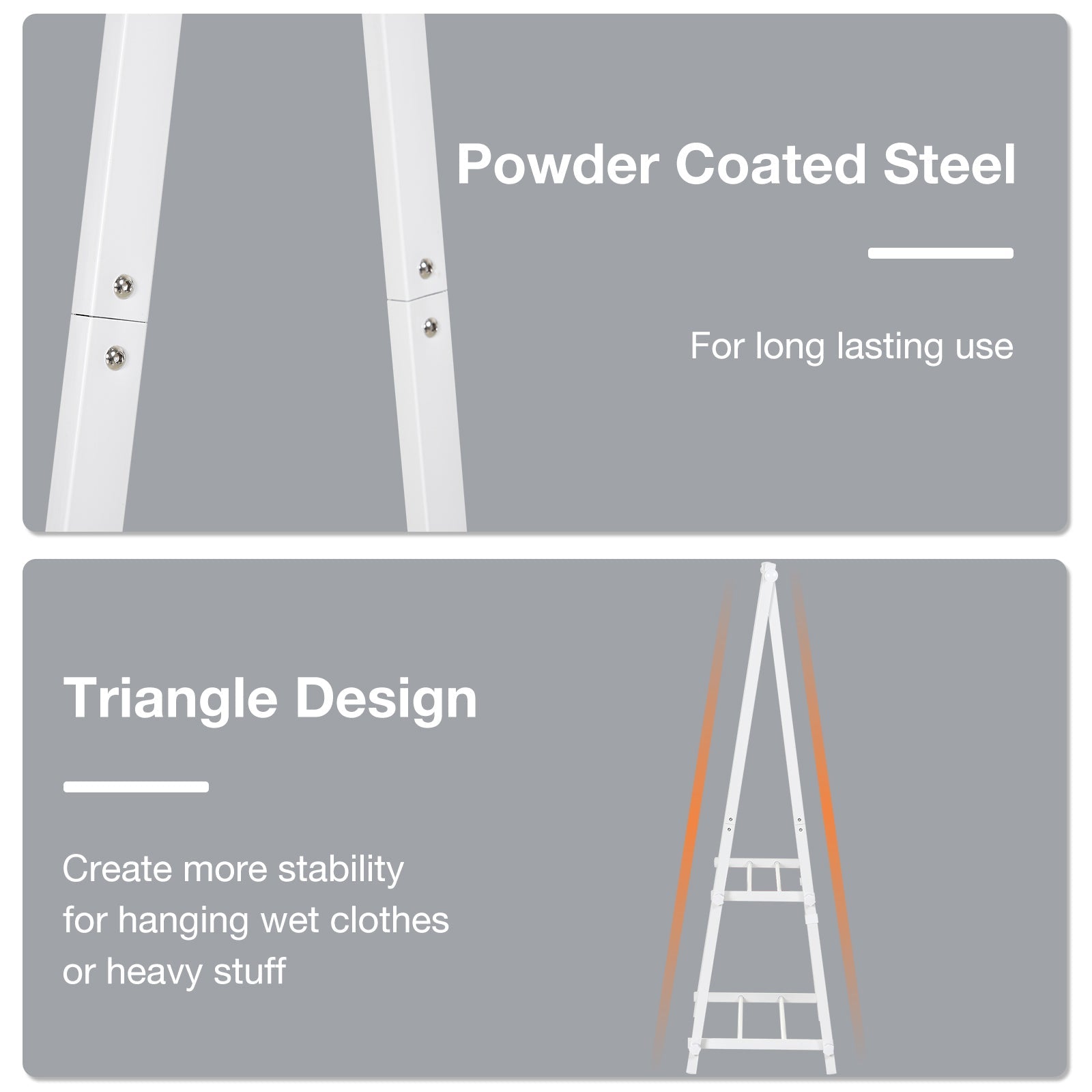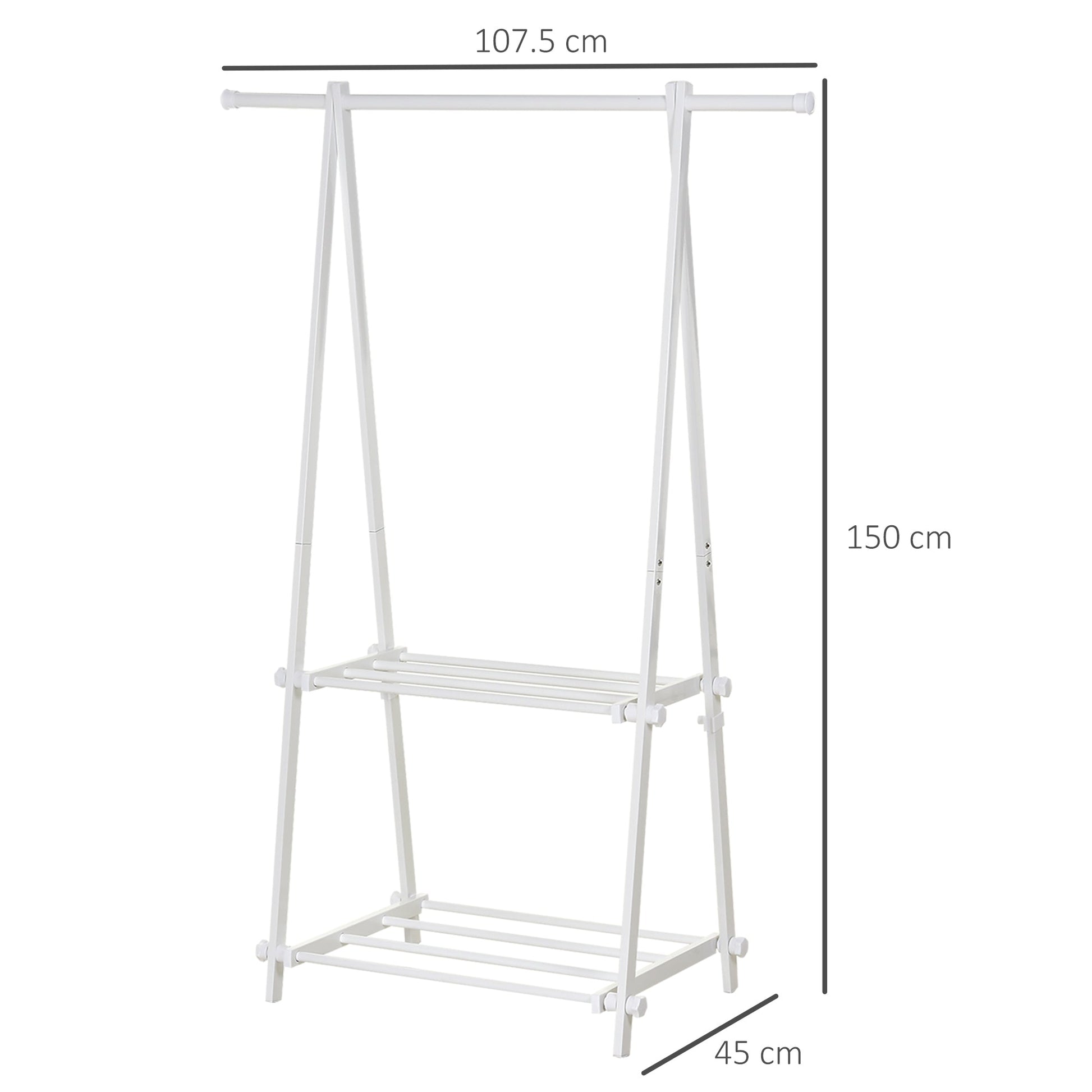 Keep your clothes neatly organised thanks to this rail from HOMCOM. Powder coated steel forms the frame for a tough and reliable structure which can hold up to 20kg, and it's 'A' shape promotes balance even when fully loaded. It's made with two slatted shelves on the bottom for extra storage, and is finished short legs for extra stability. Fresh white colour for elegance.