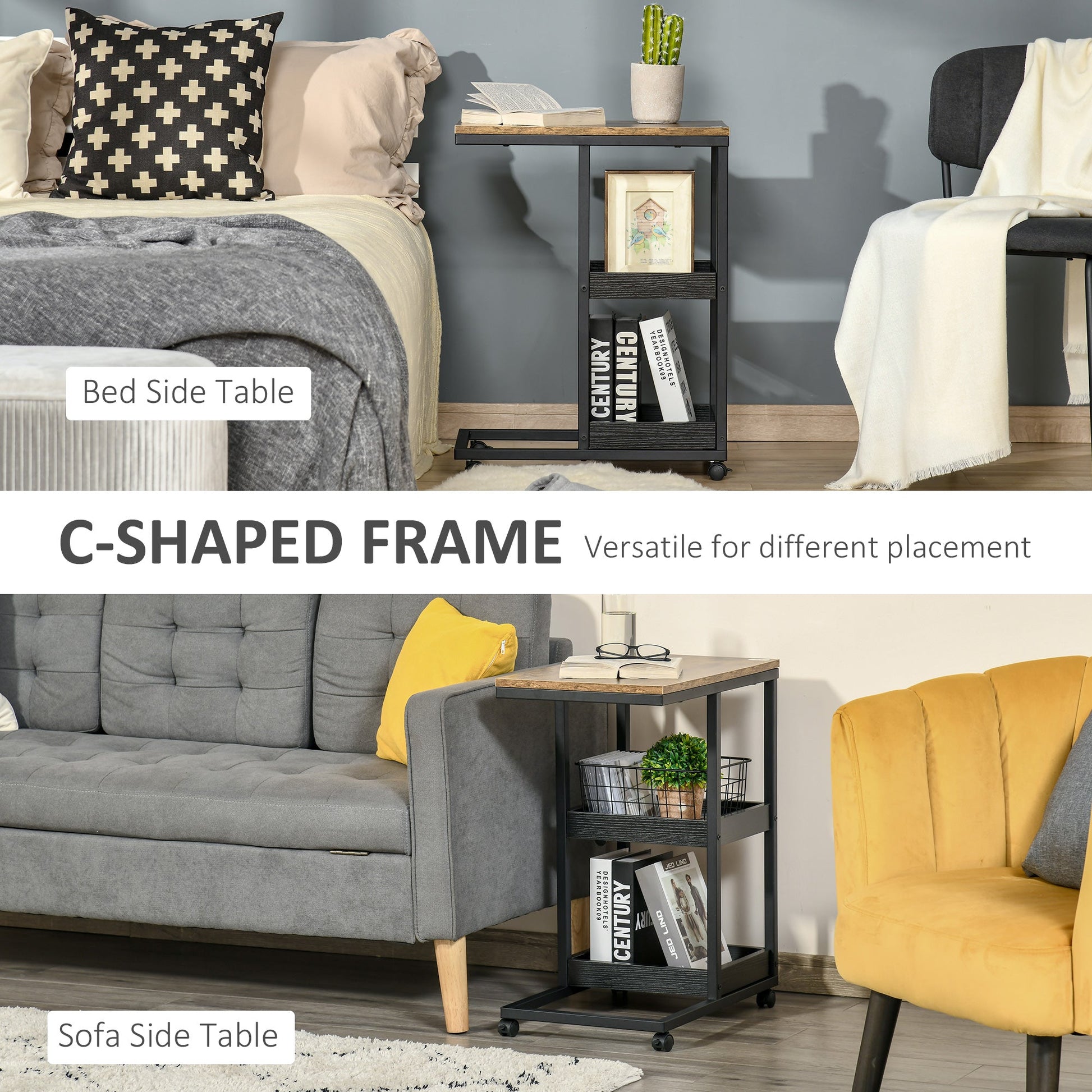 HOMCOM Mobile Sofa Side Table Set of 2, Industrial C-Shaped Rolling Couch Table with 3-Tier Storage Shelving Four Lockable Wheels Steel Frame, Dark Brown