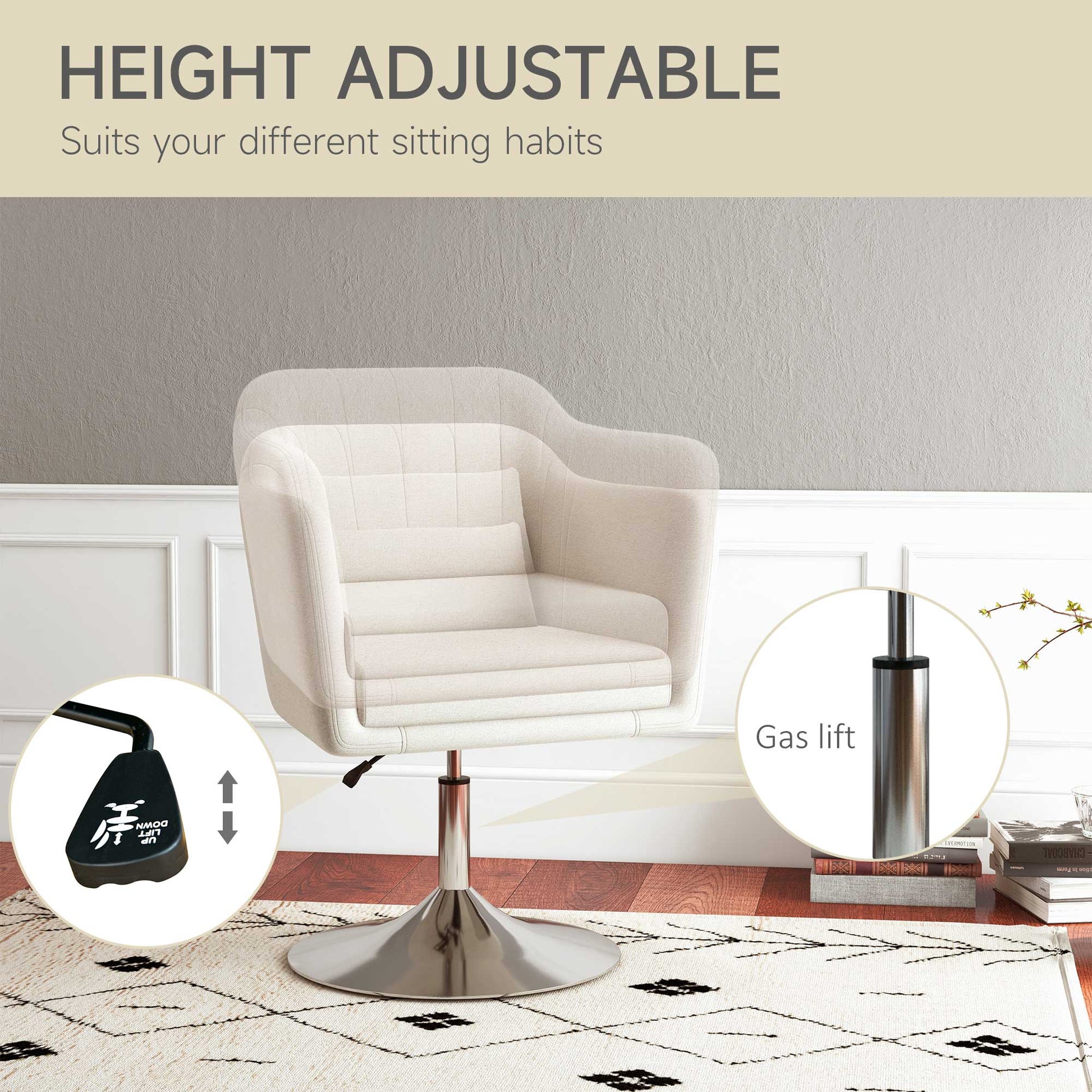HOMCOM Modern Accent Chair with Swivel Base, Height Adjustable Arm Chair with Pillow for Living Room, Bedroom, Cream White