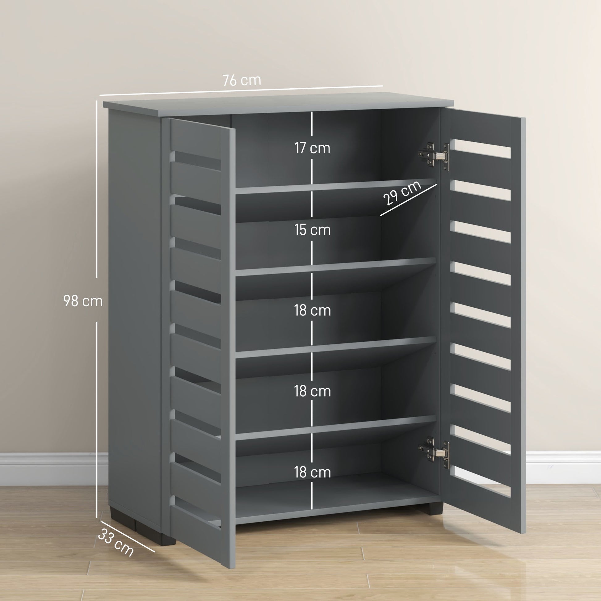 Organise and store footwear in classic, beautiful style, with this HOMCOM shoe storage unit. It has five tiers, with four adjustable shelves, providing space for 15 shoe pairs - great for individual and shared use. This slim shoe cabinet comes complete with two slatted doors to bring inside ventilation.