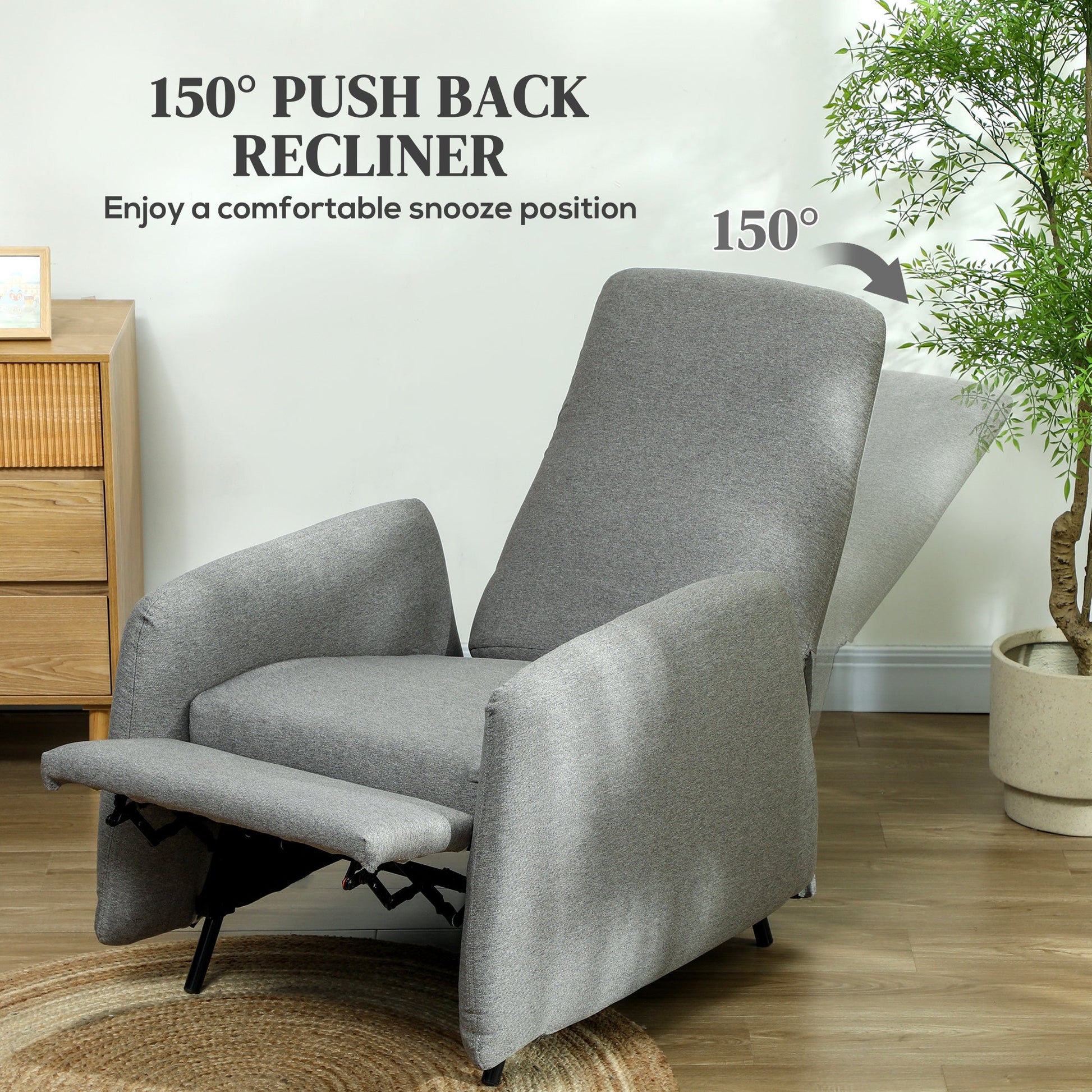 Experience the support and comfort of the HOMCOM reclining armchair, featuring a 150 push-back recline with built-in footrest for the relaxation. To return upright, push the footrest back into place with your heels and the back of the recliner will simultaneously return to its original position. Enjoy the supportive comfort with pocket spring seat filled with high-density sponge, wrapped in breathable linen-feel fabric. Make your lounging experience a bliss with this living room chair.