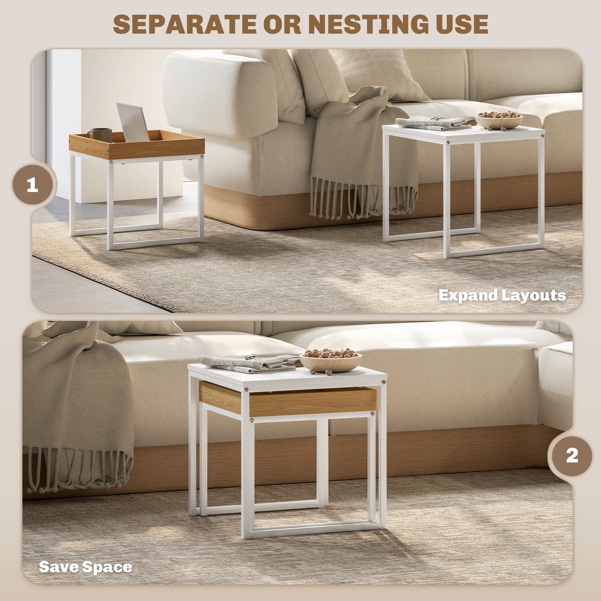 Striking style, doubled with this HOMCOM nest of tables. Comes with a white boxy table and a wood-effect tray top boxy table: pair together or use separately - whether that's for keeping food and drink close by, working from, or just adding to the overall aesthetic. Both end tables are supported with their powder coated steel frames.