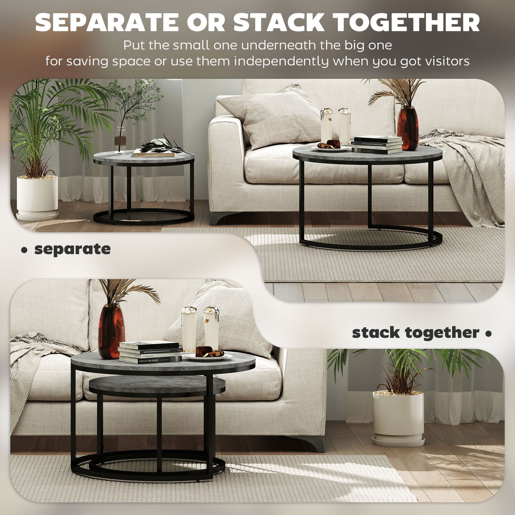 Whether you pull them apart, or push them together, these two tables from HOMCOM are sure to make the right impression in your home. The set comes with a small and large table, so they overlap each other perfectly; sliding together for compact storage. Each table base is made from steel to ensure a stable structure. The table tops are covered in a beautiful cement-effect which will hold style and beauty for years to come.