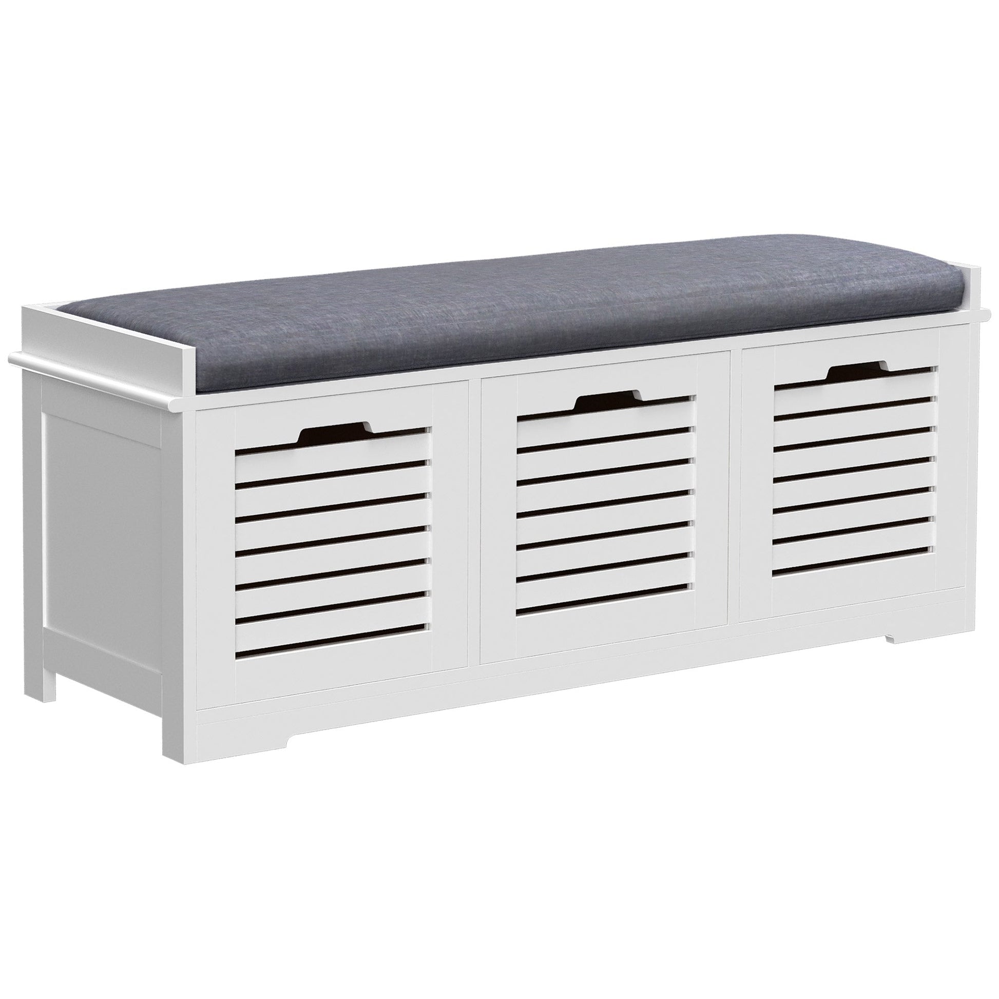 Give your shoes somewhere proud to stand with this storage unit from HOMCOM. Its design is made of three compartments for lots of holding space, with a flat cushioned top so you are able to sit on it. Made from MDF, the frame is tough and reliable for everyday use. Using sponge for the cushion for comfort, it is wrapped in linen so it is smooth and easy to wipe clean. The slatted doors of the compartments allow fresh air to circulate through, with low corner feet elevating the unit to finish.