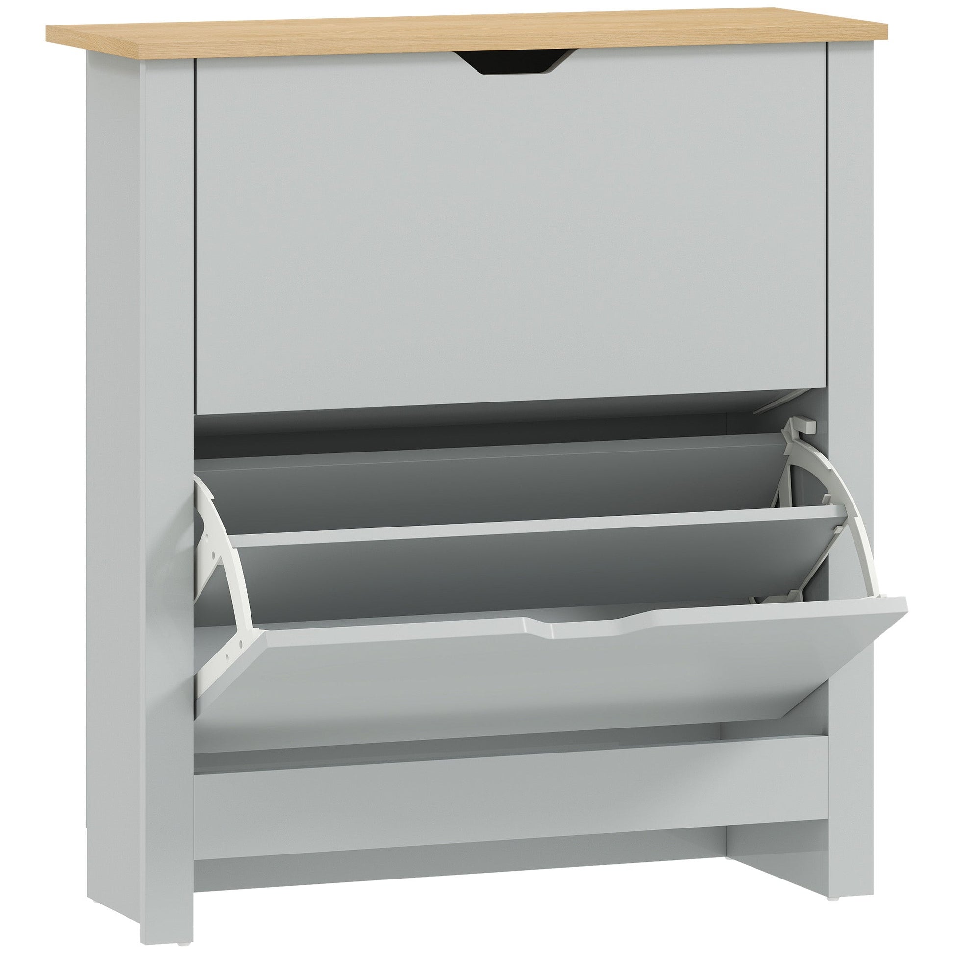 This compact shoe cabinet from HOMCOM will help to keep your home effortlessly decluttered. A particle board construction ensures a tough and solid frame, with a smooth coating so it can be cleaned easily. Each drawer features a two-level shelf - holds up to 6-12 pairs of shoes. Groove handle to open and close easily. Complete with a flat tabletop for extra holding and display space, with feet to keep the unit balanced.