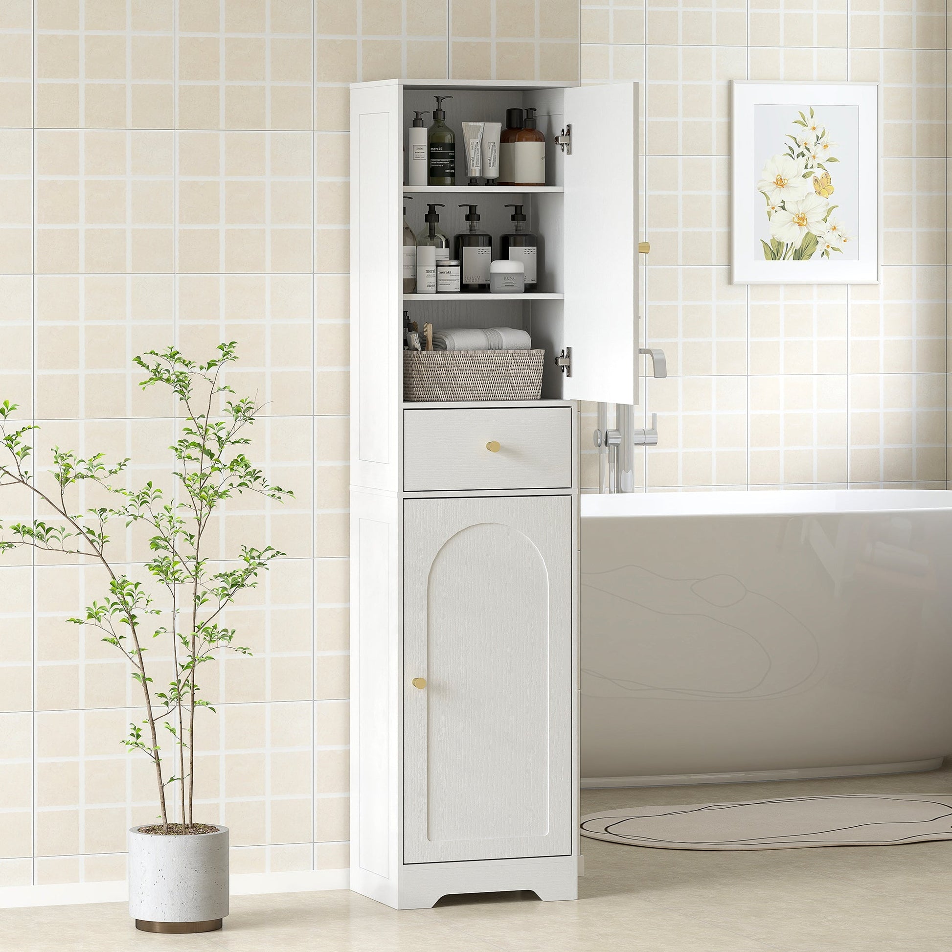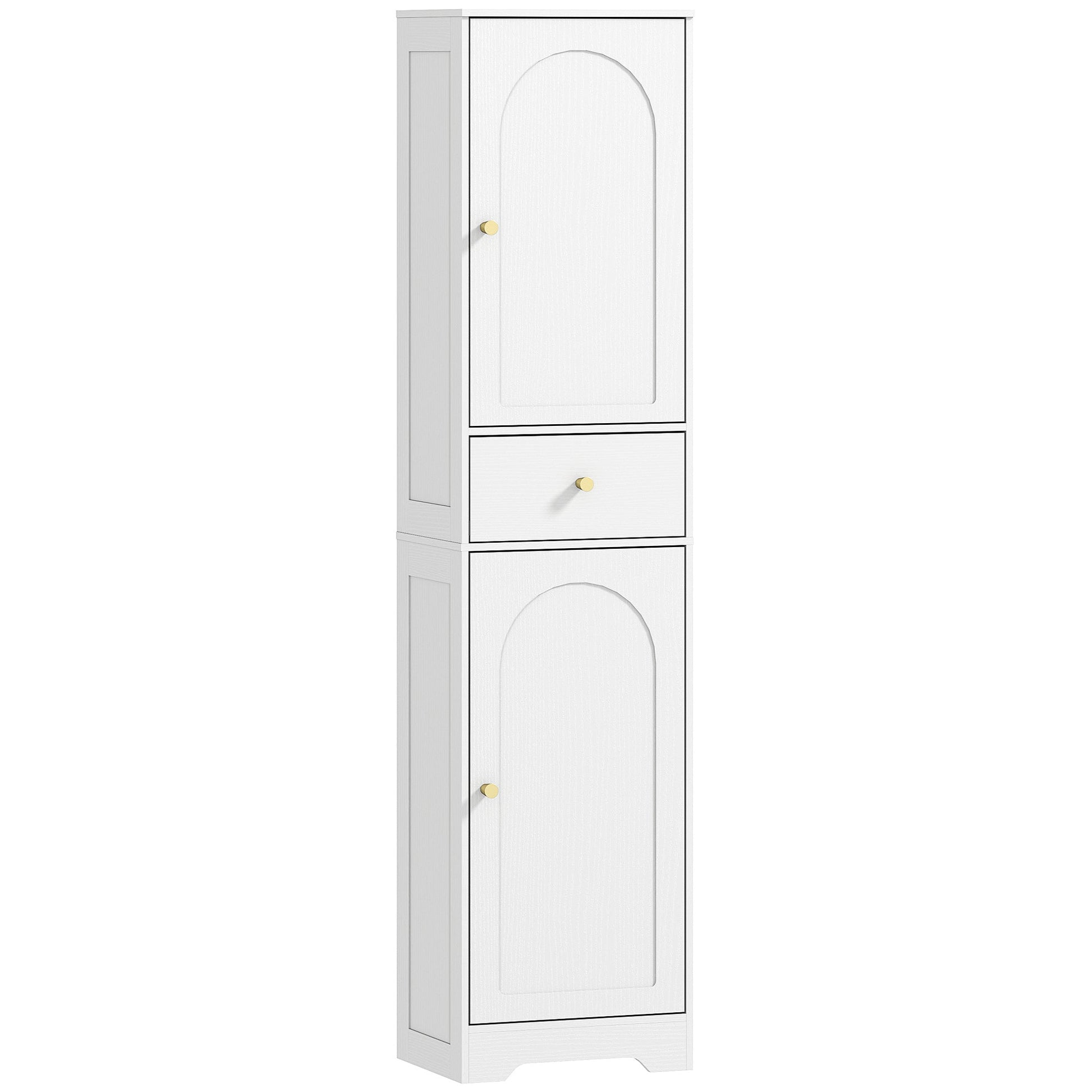 Bring calm and order to your bathroom with this tall yet slim cabinet. Two single-door cupboards and a middle drawer keep toiletries, towels and daily essentials neatly tucked away, while a three-level adjustable shelf in the top cupboard adapts to your needs. With its elegant embossed finish, arched doors and gold-tone knobs, the slim bathroom storage unit blends style with practicality. A great fit for compact bathrooms—safe, stable and full of charm.
