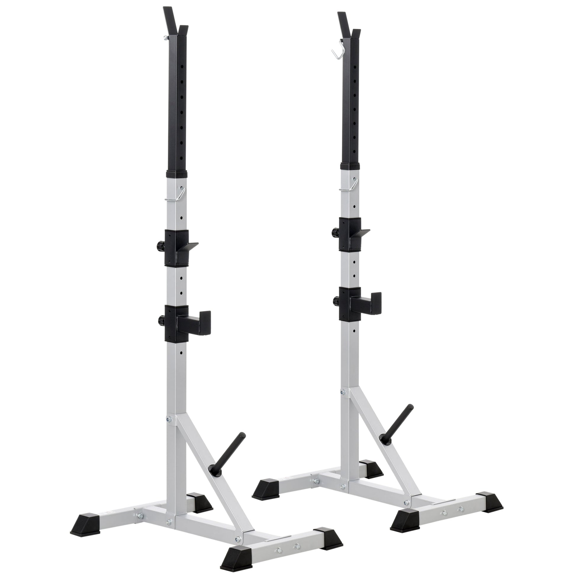 Bring gym workouts to your own home with this barbell rack from HOMCOM. Formed heavy-duty steel, the frames are tough and sturdy for long-lasting use, able to hold up to 200kg with ease. They can be set to different levels with a 'J' shaped bracket on the top for extra room. Both racks are finished with 'H' shaped bases to ensure stability, with rubber covers on all sharp edges for safety. An excellent way to work on squats, bench presses, lunges, deadlifts and more during any time of the day.