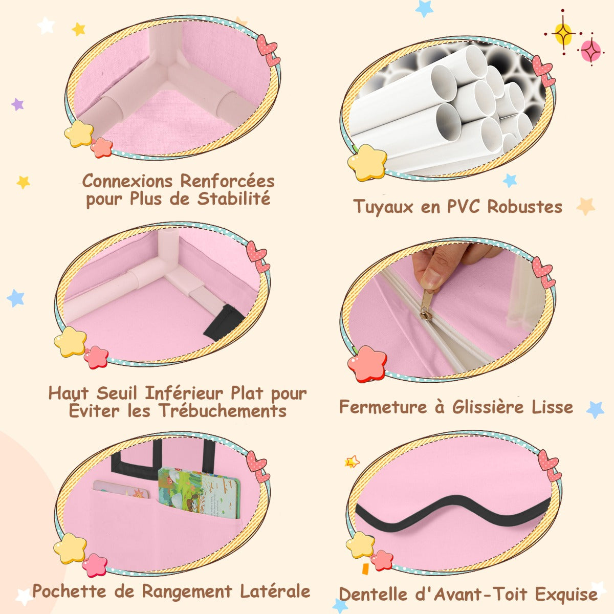 The spacious space allows kids to invite their best friends to have a role-playing game together. With the breathable mesh curtains, they won’t feel frowsty inside. Supported by strong PVC pipes, the playhouse is very sturdy and stable. The anti-slip mat prevents the tent from sliding, while its soft coral velvet surface renders skin-friendly touch. The upgraded bottom tube and connector as a flat threshold, making it easier for your kids to get in and out and not trip over. Besides, the eye-catching star lights create a warm and cozy atmosphere. Children can serve the tent as a reading nook, cozy corner or a napping spot.If you are looking for a kids play tent like this, do not hesitate to place an order! Extra Spacious Space: Measuring 121 x 101 x 137cm (L x W x H), this children's play tent is spacious enough to accommodate up to 3-4 kids or 2 adults at a time. It allows your little one to invite his or her best friends to play pretend games or read books together. Besides, our playhouse is also a great place for parents to spend leisure time with their kids! Stable Structure and Ventilated Design: Built with thickened PVC pipes and triangular reinforced connections, this kids play tent ensures ultimate stability and will not easily collapse. Moreover, the children's playhouse is designed with 4 large windows and breathable mesh curtains, which not only offer good ventilation for children, but also help parents to observe them from outside. Shining Star Lights and Non-slip Mat: This large playhouse comes with star lights, adding a fantastic and dreamlike atmosphere that attracts all children. The non-slip mat enhances the overall stability and prevents it from sliding during the child's play. This lovely playhouse is suitable for children's room, playroom, daycare center, kindergarten, etc. Perfect Gift for Girls and Boys: Our play tent feels like a sweet castle, providing a private and comfortable space for children to entertain, read, nap and more. The kids playhouse is perfect for boys and girls aged 3-10 years old, which accompanies them grow up and creates wonderful childhood memories. It is sure to be a huge surprise on their birthdays or Christmas. Quick Assembly and Easy Cleaning: Thanks to the simple structure and detailed instructions, you are able to easily put this children's play tent together, saving more time and energy. In addition, the cotton canvas material is tear-resistant, fade-proof and easy to clean, and you can put the cover in the washing machine to make it as good as new.