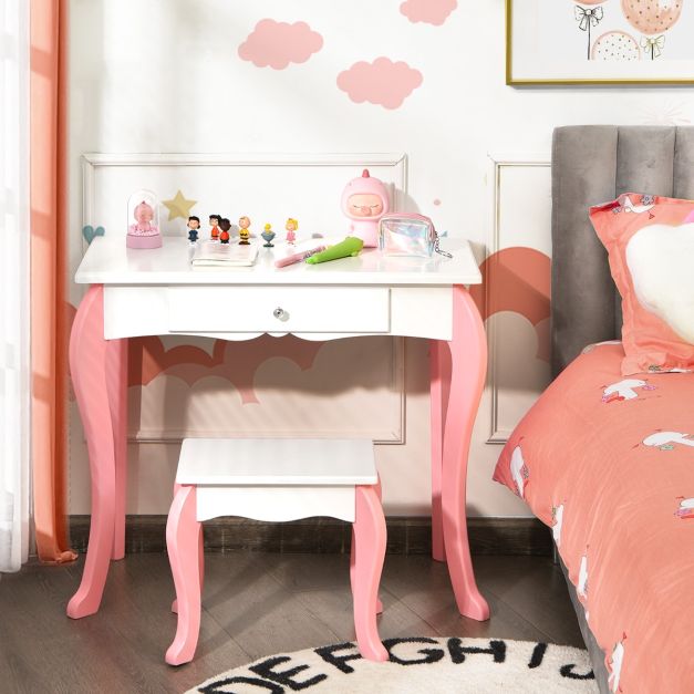 The 360°rotating mirror provides a clear reflection for makeup and hair styling fun. Its dual-use functionality transforms it into a convenient writing desk, promoting play and activities. The set features a matching stable stool and 3 storage drawers to organize jewelry, cosmetics, and accessories. Safety is paramount with rounded corners and a shatterproof acrylic mirror, making it a secure and comfortable space for kids to enjoy. 360°Rotating Mirror:Your little on will enjoy a clear view for makeup and hair styling with the oval mirror. Moreover, the mirror canrotate 360 degrees, providing kids with the perfect reflection. Dual-Use Versatility:The detachable top allows for dual functionality as a writing desk, promoting creativity and providing a space for various activities. The matching stool offers a stable seating option.The 3 storagedrawers offer ample storage for jewelry, cosmetics, and accessories. Safe andChild-Friendly Design:Designed with rounded corners and smooth edges for safety, this vanity table set is perfectly sized for kids, offering a secure and comfortable place to play. Moreover, the shatterproof acrylic mirror is built for added safety. SturdyConstruction: Crafted from high-quality MDF material, this dressing table and stool set is stable and long-lasting. The curved legs with anti-slip pads provide extra stability while protecting floors.The anti-toppling device ensuresstability and preventsaccidents. Easy Assembly andMaintenance:With detailed instructions and included hardware, assembly is quick and simple. The smooth and waterproof surface is easy to clean with a damp cloth, ensuring hassle-free maintenance for lasting use.