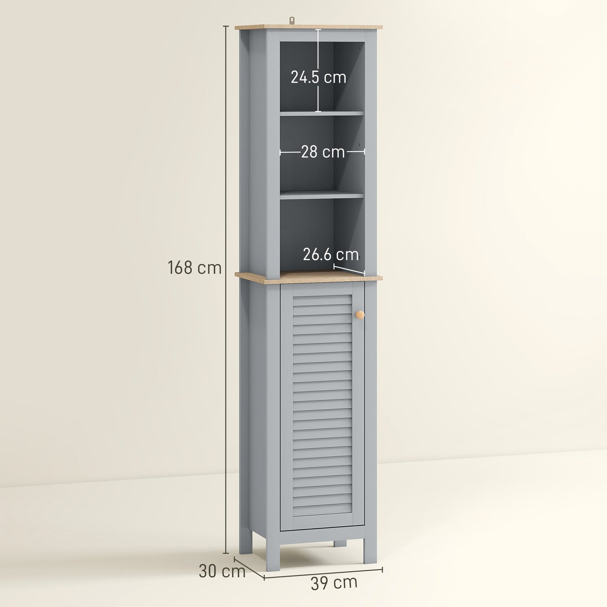 Bathroom storage doesn't always have to be clean and contemporary. If you're looking for something a little different - go for this narrow freestanding cabinet from kleankin. A slightly boxy shape pairs with the mid-grey tone and the contrasts with the wood-effect panels for some retro rustic charm. It is formed of a bottom cupboard and three upper shelves for decent amount of open and discreet storage. It's made from MDF, so it's durable, with the four stump legs preventing direct contact with the floor. Finished with a wooden handle on the door to open and close easily.