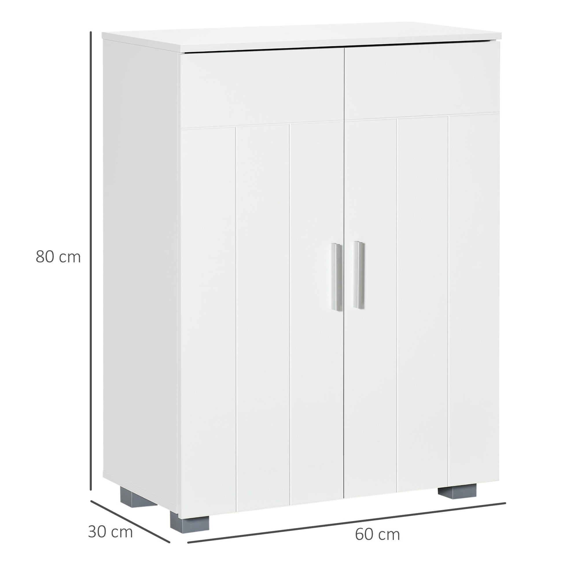 A simple bathroom storage cabinet, made ready for your home space. This kleankin number comes in a white boxy design, with panelled doors for a point of difference. Inside, there are two shelves for three storage areas; the two shelves can be moved up and down to seven different positions, making it easier to fit in different sized toiletries, towels and other products. Small feet elevate the unit from the floor, helping prevent moisture damaging the bottom. Finished with sleek metal handles.