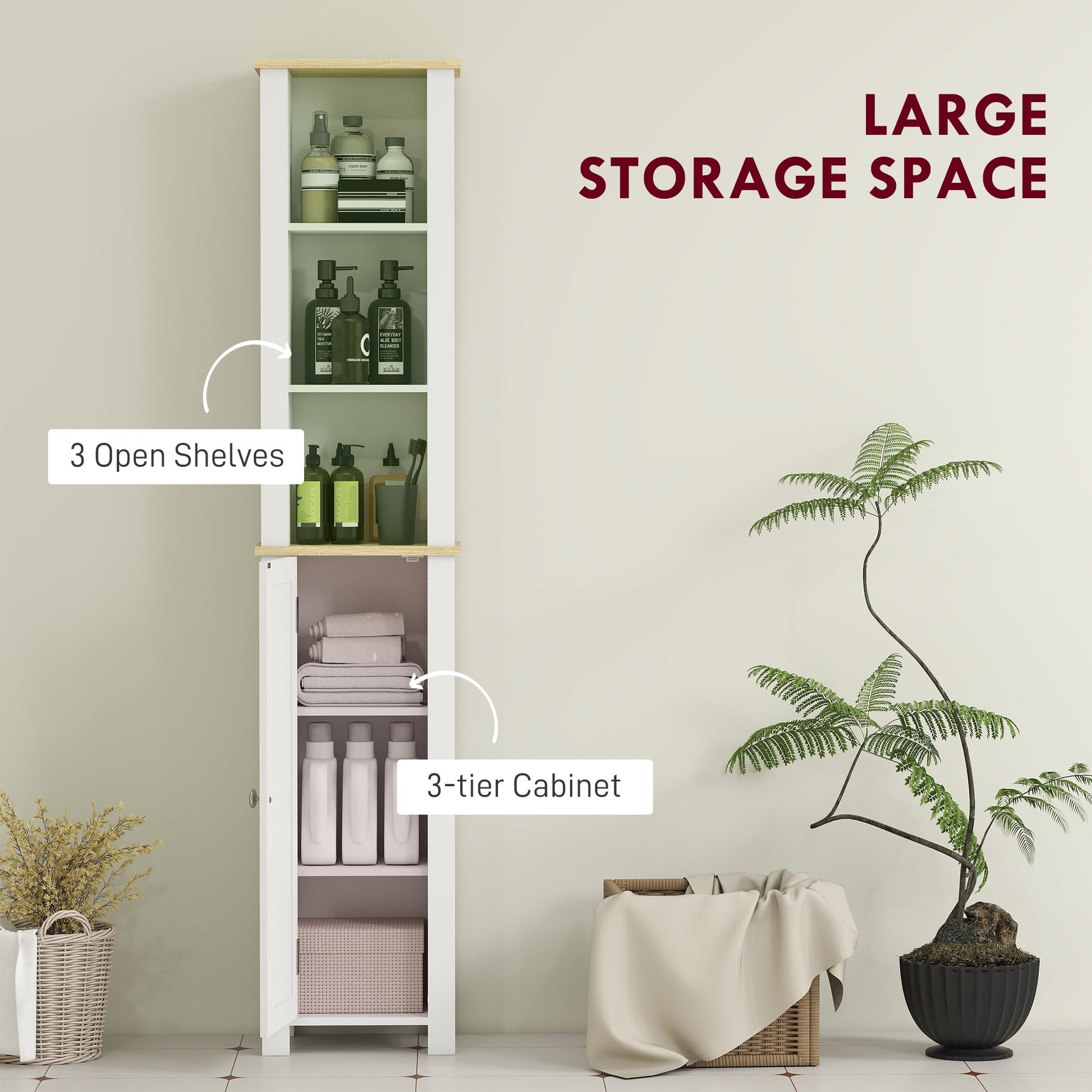 This kleankin slim bathroom cabinet unit provides extra space, wherever needed. It features three open compartments, a three-tier cupboard and a flat top - plenty of room for towels, hygiene products and cleaning supplies, complete with a round handle to open the door easily.