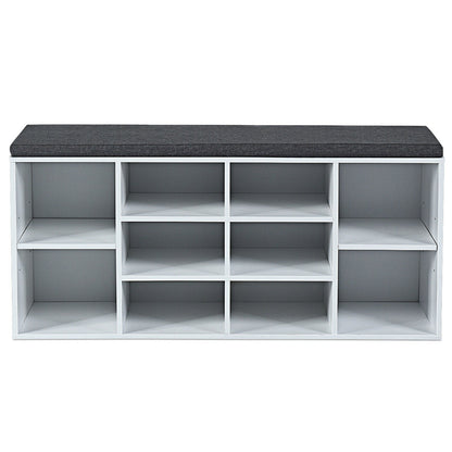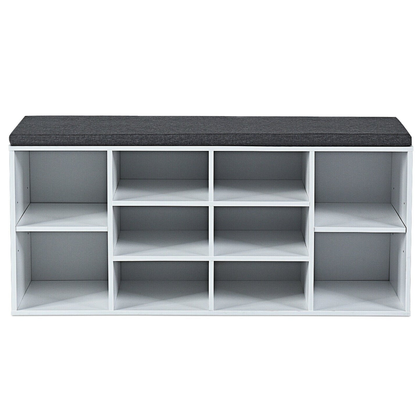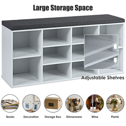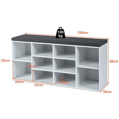 This shoe bench, with its padded cushion, is a great addition to any home providing lots of storage compartments. This large shoe bench offers 6 pre-set compartments in the centre of the bench, with the 4 outer compartments height adjustable, for large boots and shoes. The thick, high-density cushion offers a comfy seat to put on or take off your shoes and is kept in place with hook and loop fastenings. Alternatively, this storage bench could be used for storing other items such as books, toys and games, and the bench can be used as somewhere cosy to sit. A versatile piece of furniture, suitable for the hallway, bedroom, porch, etc. Don't hesitate. Order it today! 6 pre-set compartments Perfect for your hallway, bedroom, living room Thick high-density padded cushion for comfort Easy to assemble with hardware and easy to follow instructions provided Made from premium chipboard, which is strong, stable and durable Adjustable and removable shelves are designed for items of different heights Detachable seat cushion is secured to the bench with 6 hook and loop fasteners
