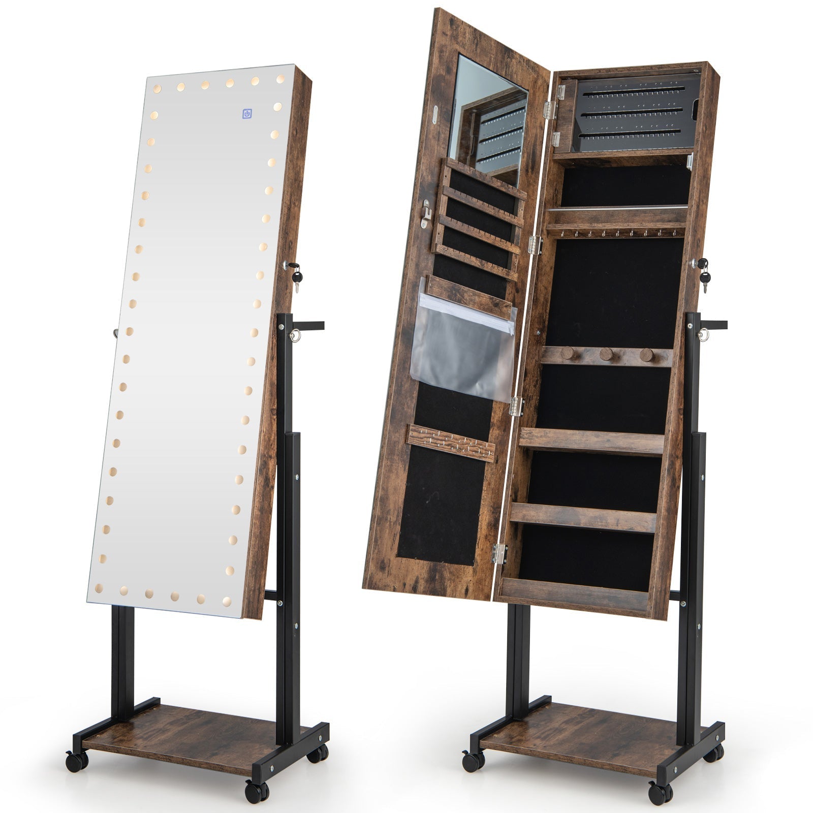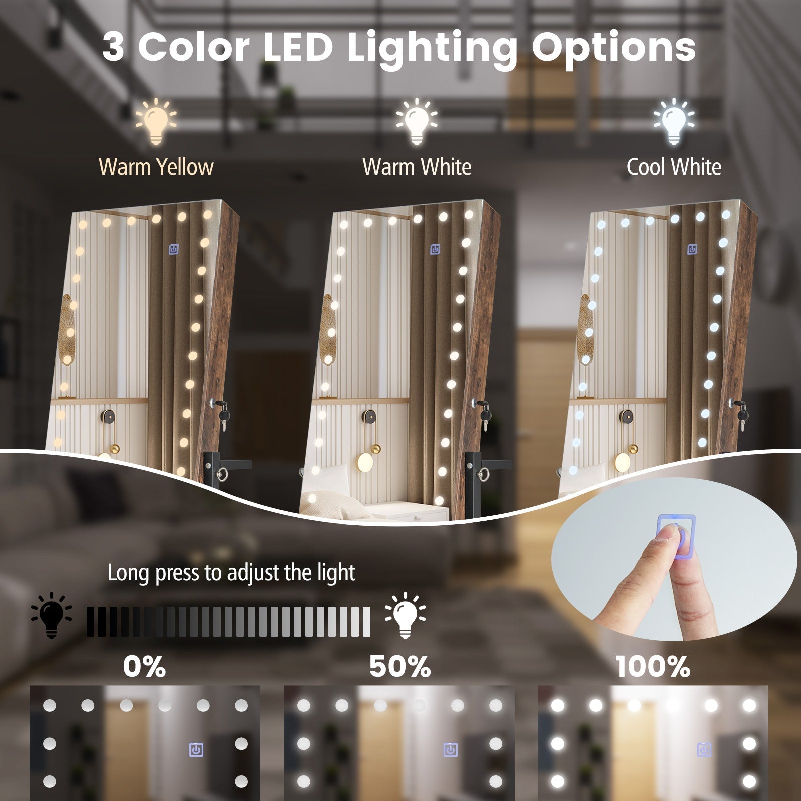 Lockable Jewelry Armoire Organizer with 3-Color Dimmable LED Full-Length Mirror-Brown