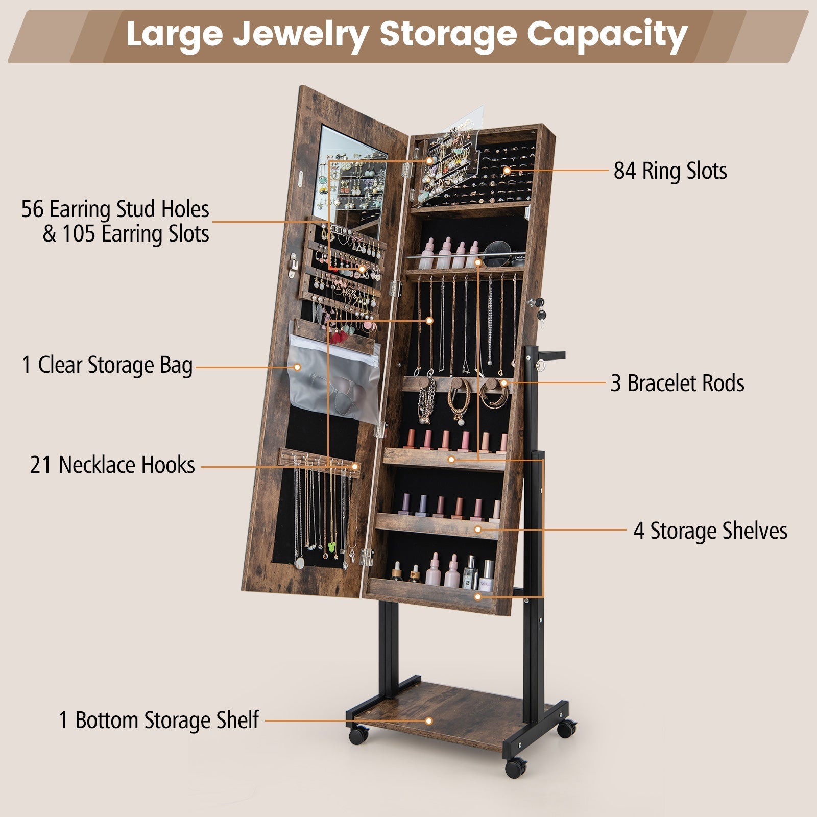 Crafted with top-notch materials, this jewelry cabinet features a stunning full-length mirror with built-in 3-color LED lights. Choose between warm yellow, cool white, or natural lighting to create the perfect ambiance for your outfits. The adjustable heights and tilt angles ensure a personalized and comfortable viewing experience for users of all heights. With its spacious interior and well-organized compartments, this cabinet offers ample storage for your entire jewelry collection. Elevate your jewelry storage and enhance your daily routine with our exceptional standing jewelry cabinet. If you are looking for a jewelry cabinet like this, do not hesitate to place an order! Romantic LED Lighted Full-Length Mirror: Designed with built-in dot LED lights, this framesless full-length mirror creates a beautiful lighting ambient. And the lights have 3 color modes (warm yellow, natural, cool white) and adjustable brightness. The operation is simple through the touch switch. 120 x 37cm Large Storage Capacity: This standing jewelry cabinet features 105 earring slots, 56 earring stud holes, 3 bracelet rods, 1 zippered storage bag, 21 necklace hooks, 84 ring slots, 4 storage shelves and 1 open storage shelf for all your collections, including jewelry, cosmetics and other accessories. Adjustable Height and Angle: This jewelry organizer is available in 3 heights from 155 to 175cm for users of different heights. Moreover, the full-length mirror can be adjusted in 2 tilt angles, offering an optimal angle to show a head-to-toe view of your outfits. Worth-Mentioning Features: The earring holder frame inside the cabinet can swing out and is more convenient for you to manage the earrings. The soft-lined storage space prevents scratching jewelry. And the lockable door with keys enhances security. Stable Metal Stand with Casters: The metal legs are more durable than wooden stands, which has better load-bearing capacity and durability. Equipped with 4 lockable universal wheels, this jewelry armoire is effortless to move around.