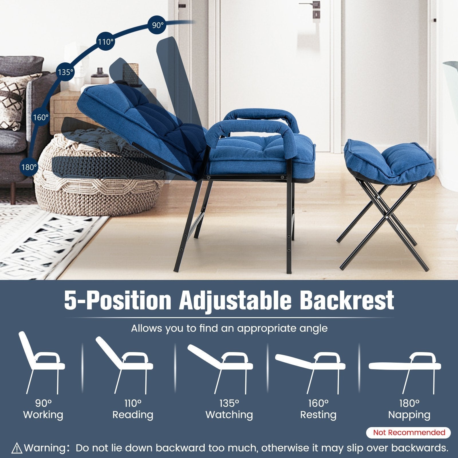 Soak in enjoyable leisure time with this sofa chair and ottoman set! Covered with skin-friendly linen cloth and filled with soft sponge, the single chair and ottoman are comfortable. Besides, the backrest can be adjusted into 5 positions to meet your various needs, such as reading a book, watching TV, taking a nap and more. Additionally, the footstool offers an extra place for your legs for further relaxation. Supported by strong metal legs with non-slip foot pads, the armchair shows excellent steadiness. Furthermore, the simple style complements well in the living room, bedroom, study and other rooms. 5-Level Adjustable Backrest: The accent chair features 5-position adjustable backrest, including 90°, 110°, 135°, 160° and 180° (not recommended) that allows you to find an appropriate angle. Warning: Do not lie down backward too much, otherwise it may slip over backwards. Designed for Comfort: Covered with skin-friendly linen cloth, the armchair and ottoman offer a soft touch. What’s more, the high quality sponge and soft PP cotton render the sofa chair and footrest more comfortable. Stable Construction: The rustproof and sturdy metal legs ensure overall steadiness. In addition, the functional non-slip foot pads as well as the reinforced X-shaped structure enables the footrest to stand more stably. Armchair and Ottoman Set: Coming with an armchair and an ottoman, the soft chair set is great for leisure time. The chair and footrest provides full-body support for the shoulder, back, waist, arms, hip and feet. By the way, the footrest stool is foldable. Wide Range of Application: The armchair with footstool is a great choice for leisure time and suitable for the living room, bedroom, study, etc. As a result, the sofa chair set accompanies you when working, reading, watching, resting or napping.