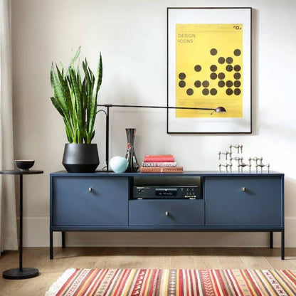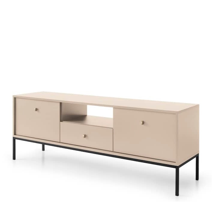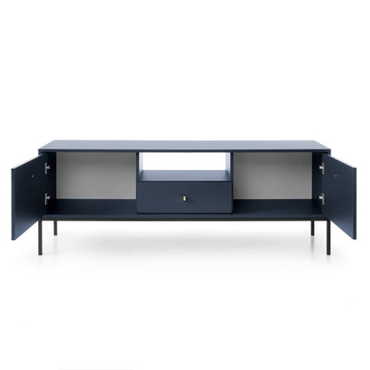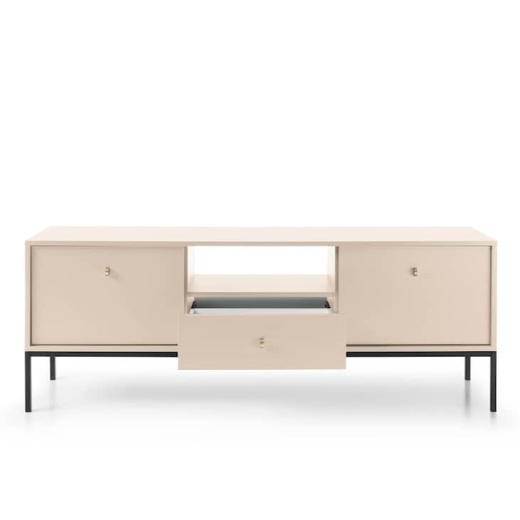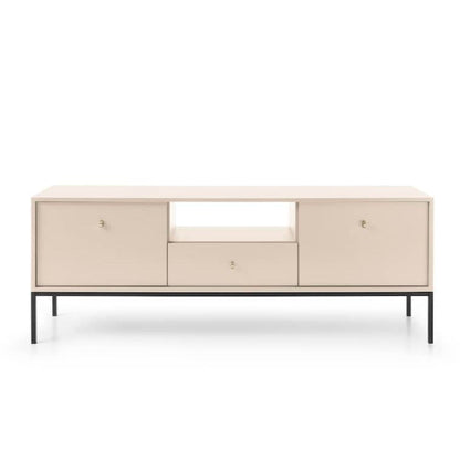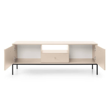 This sleek and functional Mono TV Cabinet is an ideal addition to your living room, combining style and practicality. With its chic black metal legs and high-quality laminated board, it offers ample storage with two hinged doors, a drawer, and an open shelf, making it perfect for organising your DVDs, games, and media essentials.