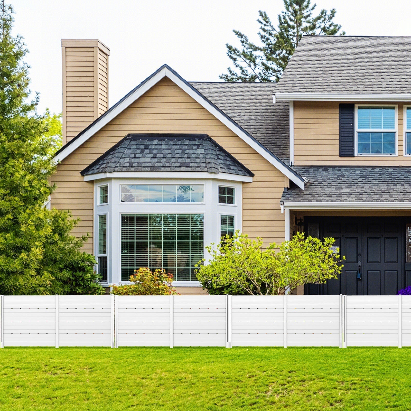 2 panels offers extensive coverage, can be configured in a right angle or flat angle Crafted of HDPE, resists aging and damage typically inflicted by the elements The HDPE panels are easy to clean with a wipe cloth, ensure it looks pristine The HDPE panels boast wood-like textures, add a touch of nature and elegance Features 5 ground stakes with 18”/45 cm length for deeply inserting into the ground Can be used for soft soil and sand, just directly hammer the stakes into the ground Can be used for hard soil, need to dig a ditch from hard soil and then insert stakes Ideal for concealing air conditioners, garbage cans, pool equipment, and more The protective caps can effectively prevent injuries from accidental collisions Adopts convenient card-slot structures, easy and effortless to set up