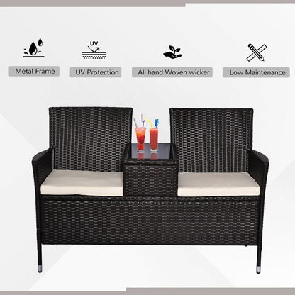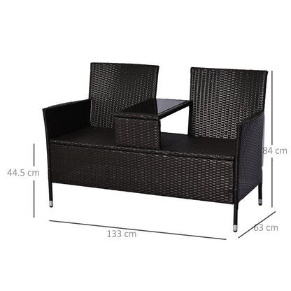 Outsunny 2 Seater Rattan Campanion Chair Wicker Loveseat Outdoor Patio Armchair with Drink Table Garden Furniture - Dark Brown