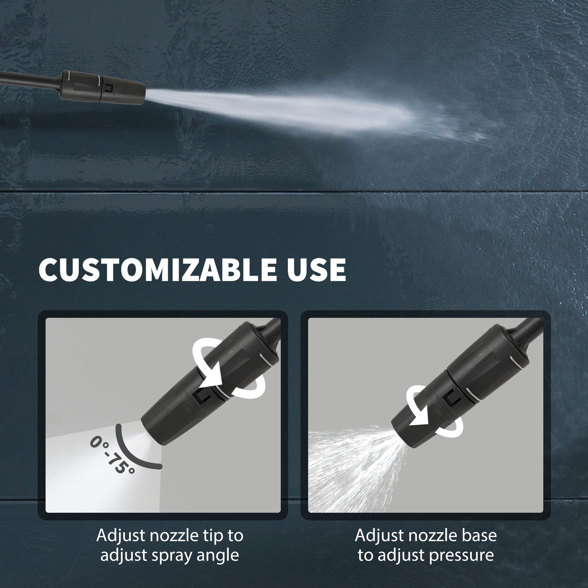 Easy home cleaning of stubborn tasks - this Outsunny portable pressure washer. 2200 W motor, with a 170 bar pressure is powerful - provides 420 litres of water per hour. Deal with a variety of dirt and stains. You can adjust the nozzle angle between 0° and 75°, making it easy to direct the pressured water to a position you require. With the six-metre long hose, five-metre long power cord and wheels, you can move it around and reach long distances easily.