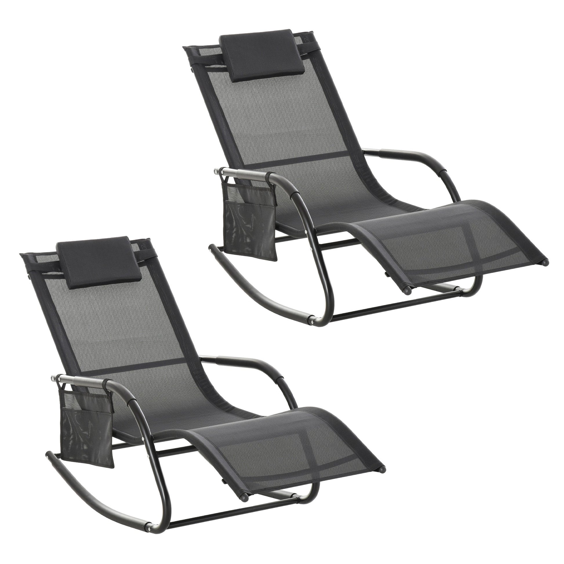 Outsunny 2PCs Outdoor Garden Rocking Chair, Patio Sun Lounger Rocker Chair with Breathable Mesh Fabric, Removable Headrest Pillow, Armrest, Side Storage Bag, Black