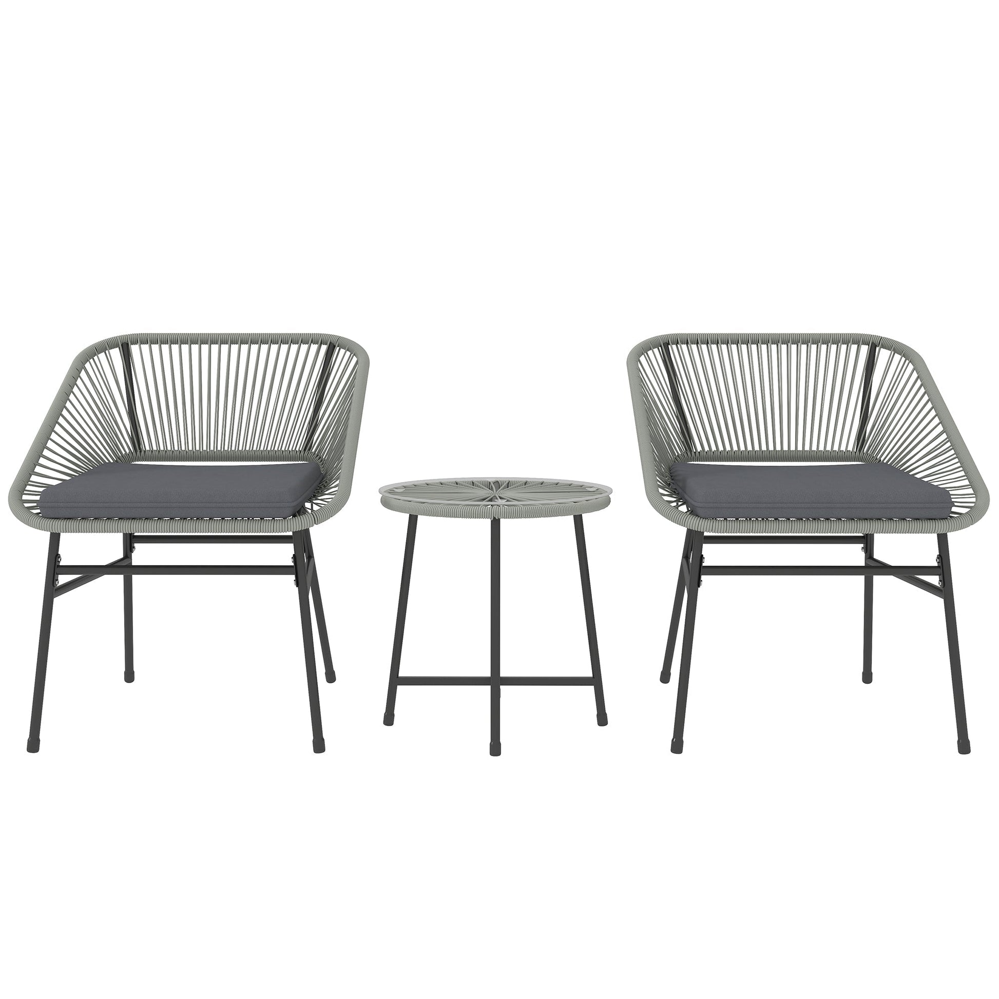 Brighten your outdoor space with the Outsunny garden furniture set, a charming bistro, or a chic lounge addition for small spaces. This small balcony furniture set has two chairs and a matching glass-top table. Powder-coated steel frames offer a strong core to bistro table and chairs. Soft seat cushions make this small garden furniture a stunning and cosy corner for friend hangouts, daily talk and sunset viewing.