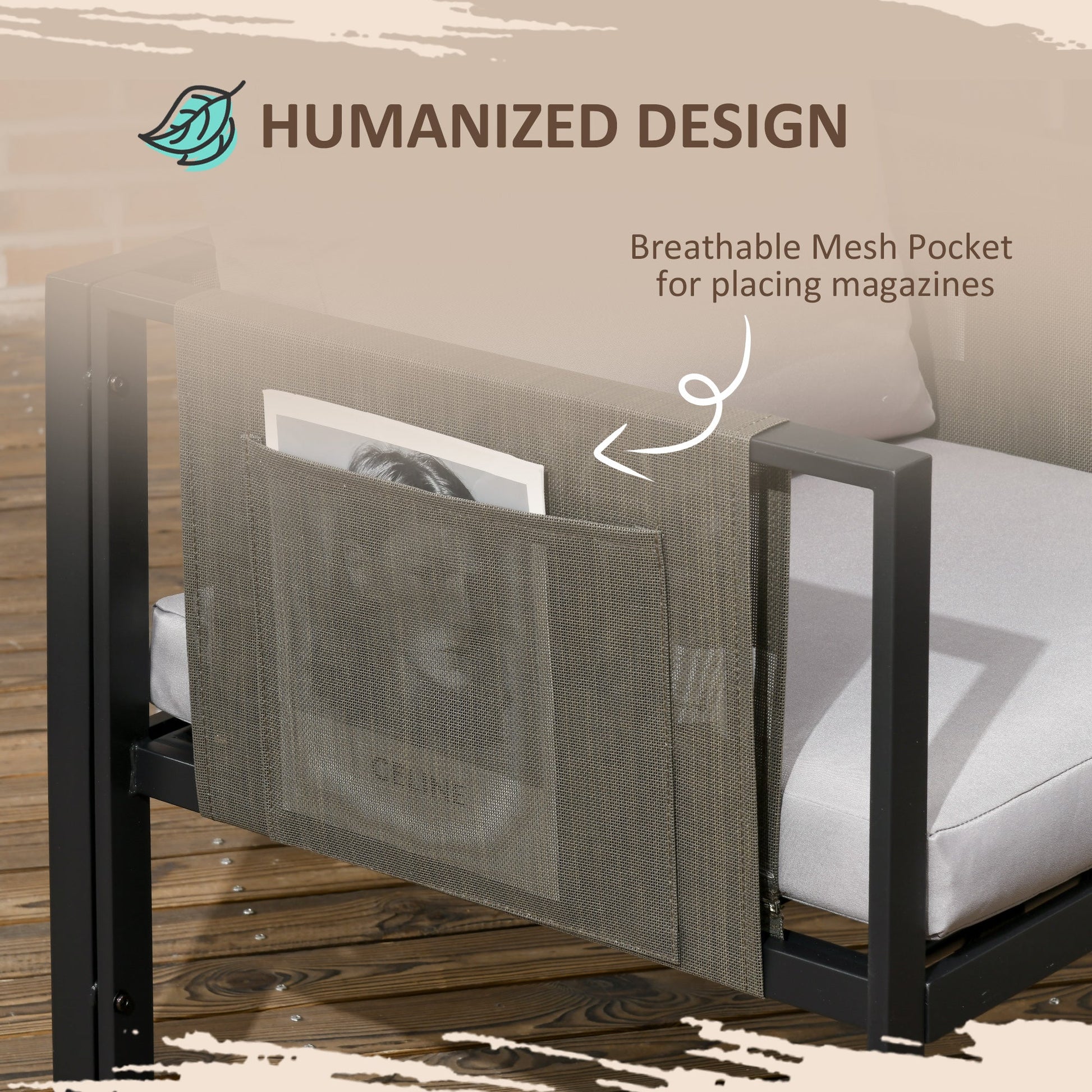Outsunny 4 Piece Metal Garden Furniture Set with Tempered Glass Coffee Table, Texteline Pocket, Outdoor Set Loveseat Single Armchairs with Padded Cushions, Light Grey
