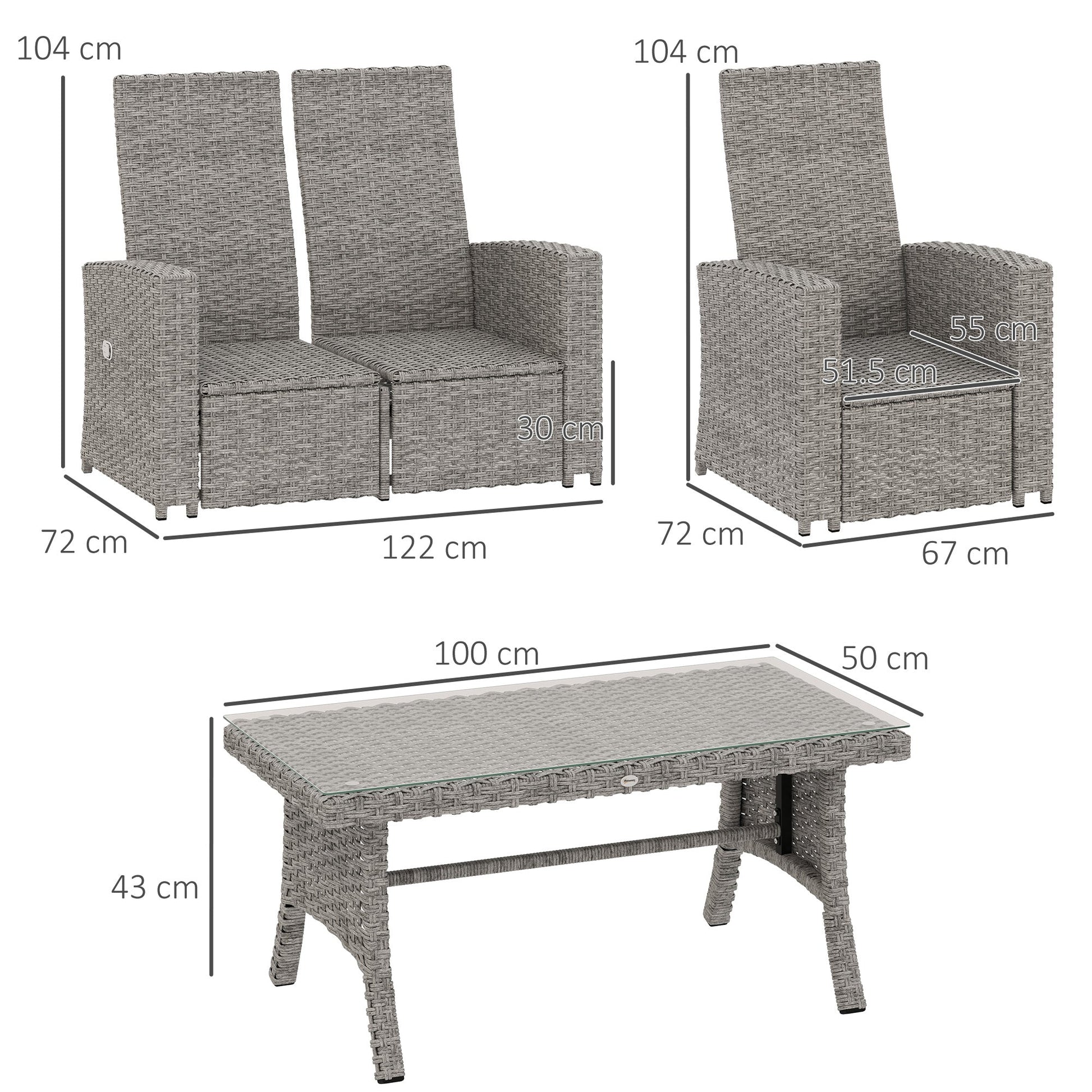 An inviting outdoors, this season and beyond: say hello to this Outsunny rattan furniture set. All pieces have a galvanised steel frame for a strong core, wrapped in plastic wicker for double the durability-and style, of course. The two armchairs have 90°-135 reclining backs-extra relaxing points scored! Seat and back cushions for comfort. Complete with a glass-top coffee table.
