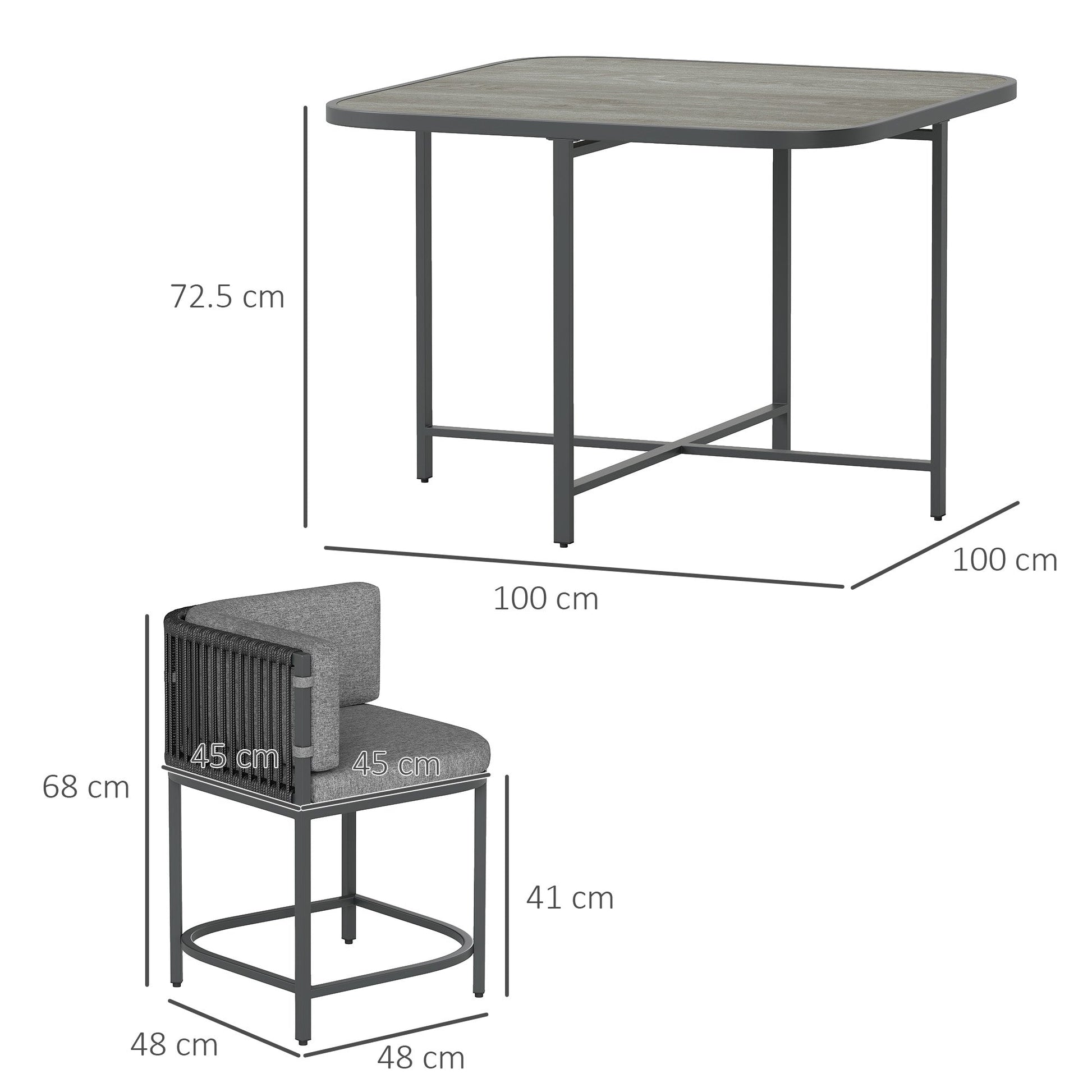 This Outsunny four-person garden table and chairs set brings you and company outdoors. Galvanised steel frames, with a powder coated finish, makes each piece of this outdoor garden furniture set strong at the core, wrapped in plastic rattan - a protective and stylish outer. The wood-effect tabletop is a classic look. Set complete with seat and back cushions for comfort.