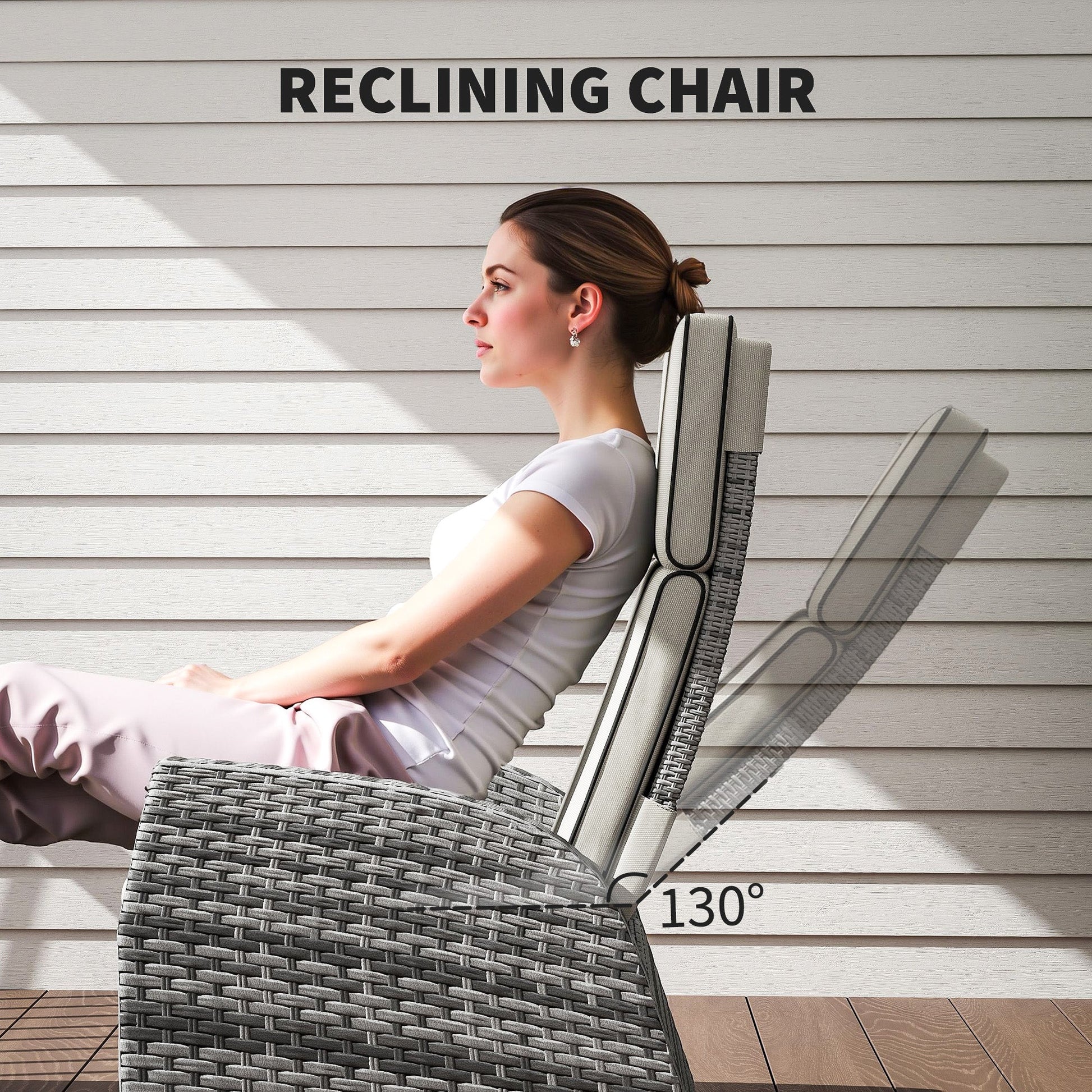 Rest and relax with company, with this Outsunny conservatory furniture. Five pieces - two reclining chairs, two footstools and a matching coffee table so you can relax with company. The two chairs have 130 reclining backs, with padded cushions for comfort. Each piece has a powder coated steel frame for a strong core, wrapped in plastic wicker for extra durability and style. Complete with adjustable feet for balance.