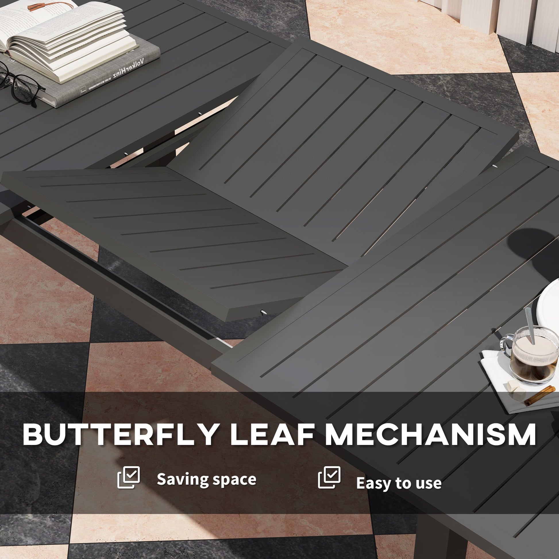 This Outsunny outdoor table comes in an extendable design - the six-seater size extends to an eight-seater: great for when you need to welcome more people to the table; it's easy to expand with the butterfly leaf mechanism. Made from aluminium, this is a tough table suitable for outdoor use.