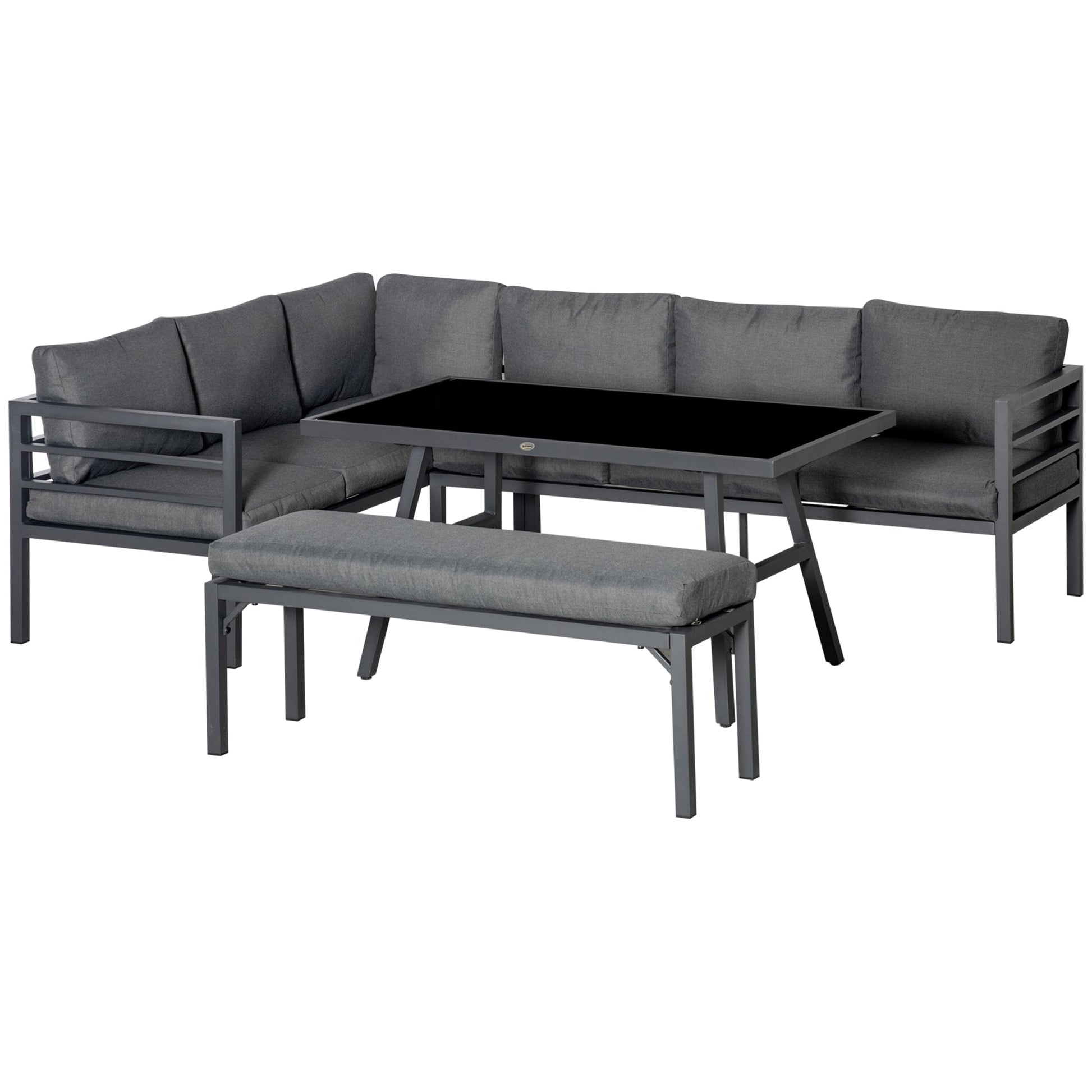 Outsunny 4 Piece L-shaped Garden Furniture Set 8-Seater Aluminium Outdoor Dining Set Conversation Sofa Set w/ Bench, Dining Table & Cushions, Grey